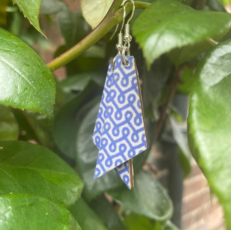 Lovely earrings made with recycled fabric decoupaged onto precut wooden shape. Happy to take commissions for alternative shapes and fabrics so you can have the perfect earrings to match your vibe! Approx 5cm length