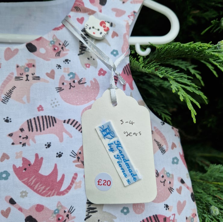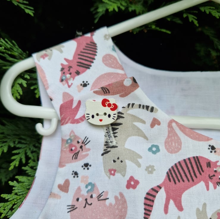 A fully lined A-line summer dress. Made from an ivory cotton fabric with a print of pink and grey assorted fun cats and with wooden cat head shaped buttons. Can be worn with a T shirt underneath, tights and a cardigan for colder days.
