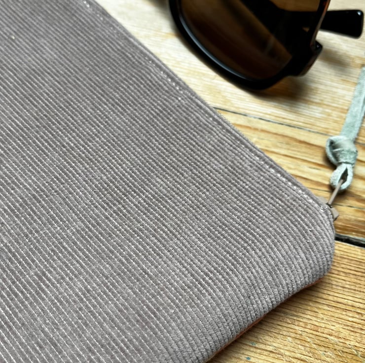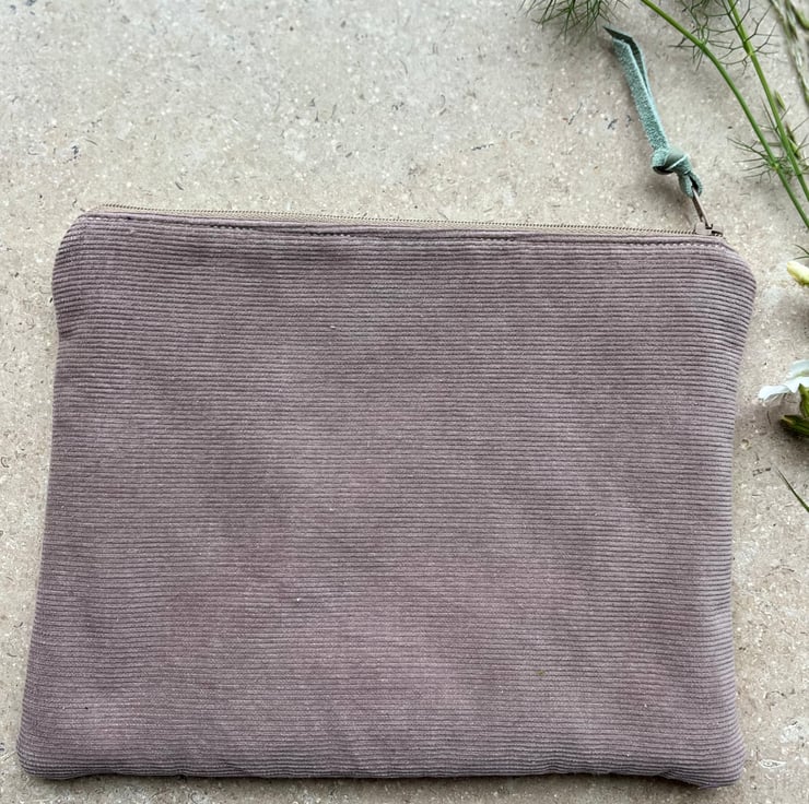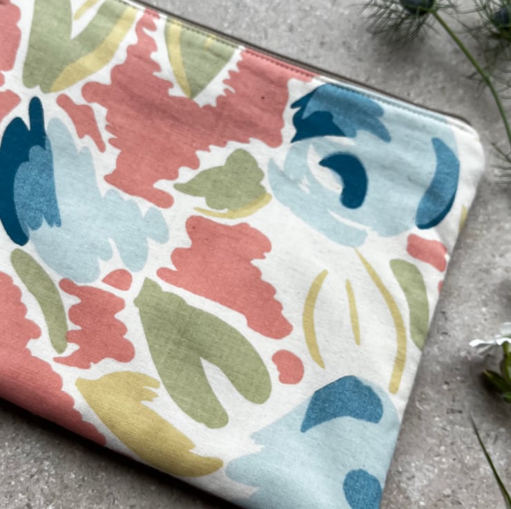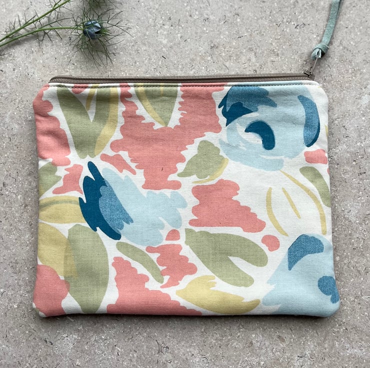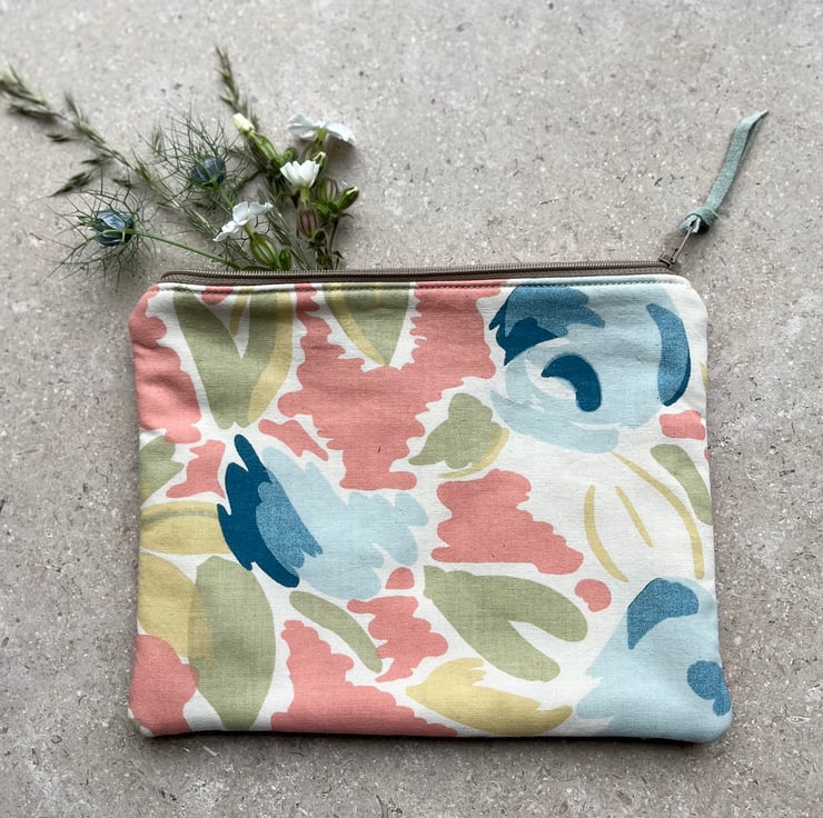 Vintage Laura Ashley floral cotton and needlecord zip pouch. This pretty fabric in soft pastel colours is from the 1980s and it’s mixed with soft mushroom corduroy from a sample swatch.