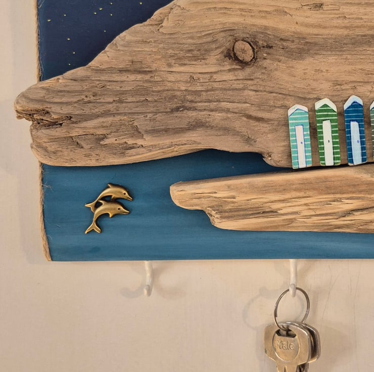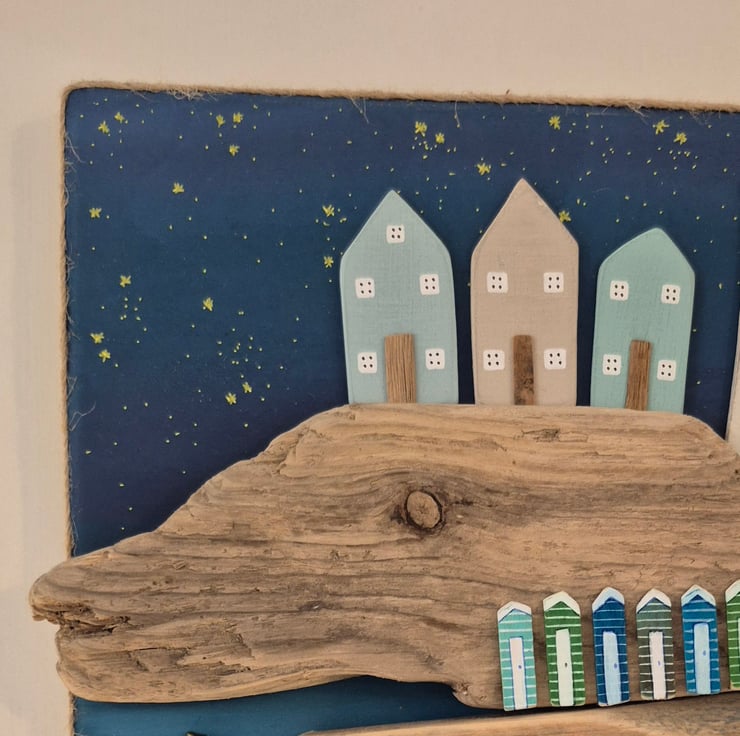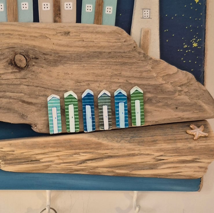 Along the bottom of the driftwood is a row of blue and green coloured beach huts.