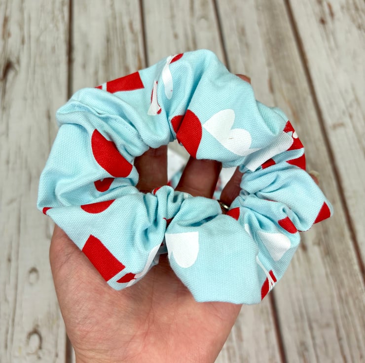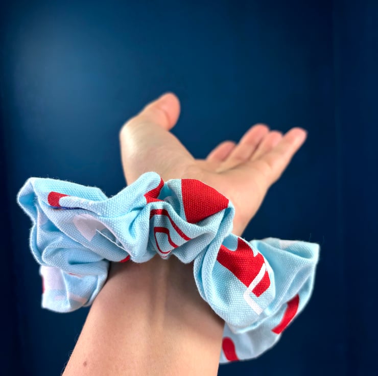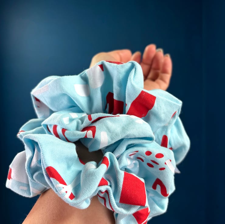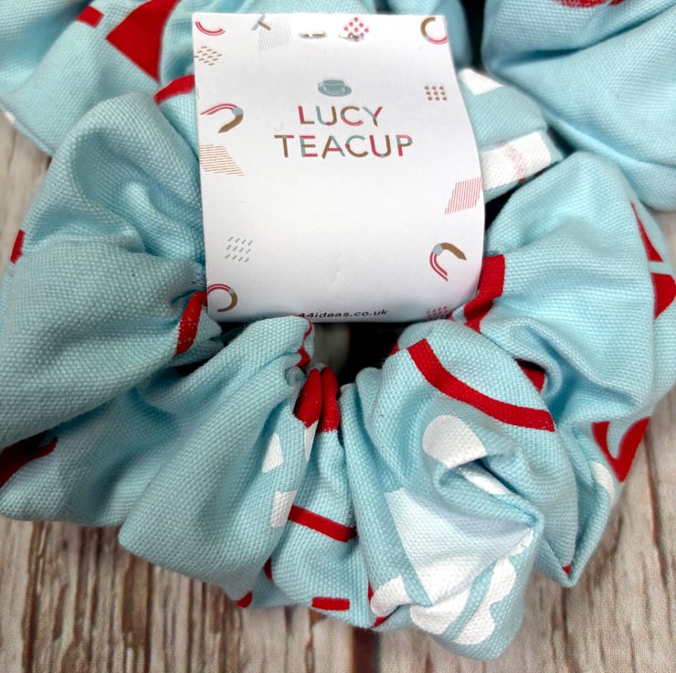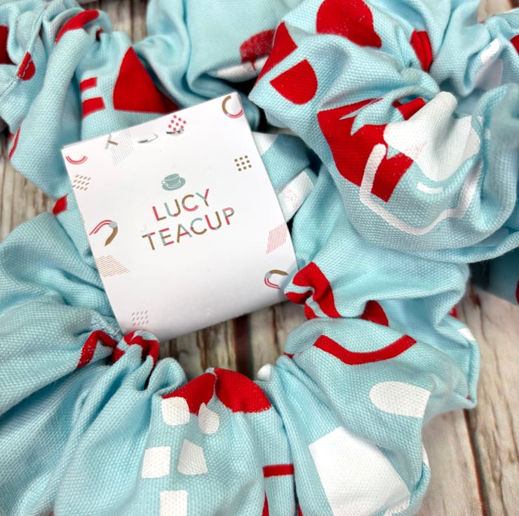 Handmade Screenprinted Scrunchies- Aqua Blue teatime abstract print red, white