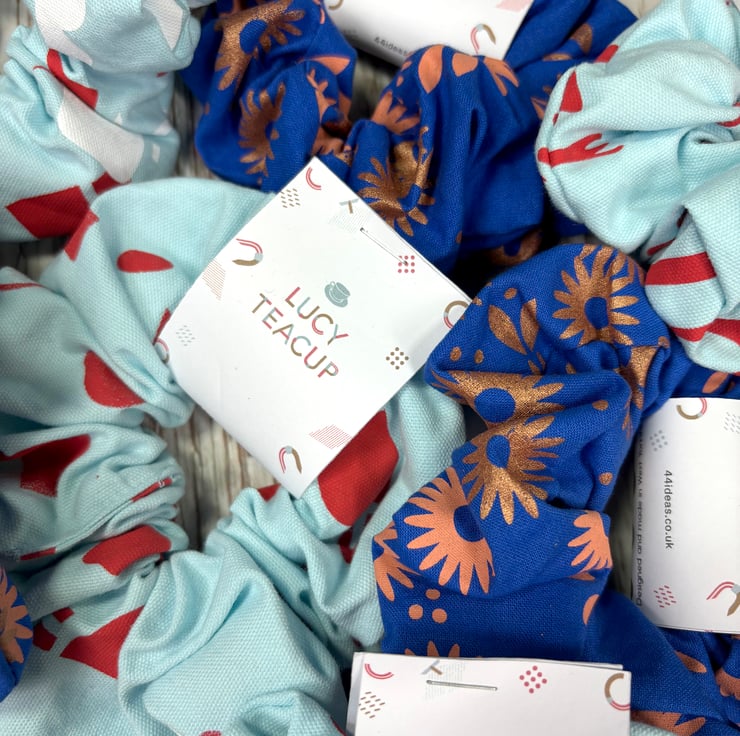 Here are my new set of scrunchies! I enjoyed a fab day screen printing using my 'Tea at Eleven' pattern on some surplus fabric using two colours-white and red. The Aqua blue fabric is a midweight cotton, which makes a sturdy scrunchie. Made from 100% fabric off-cuts.