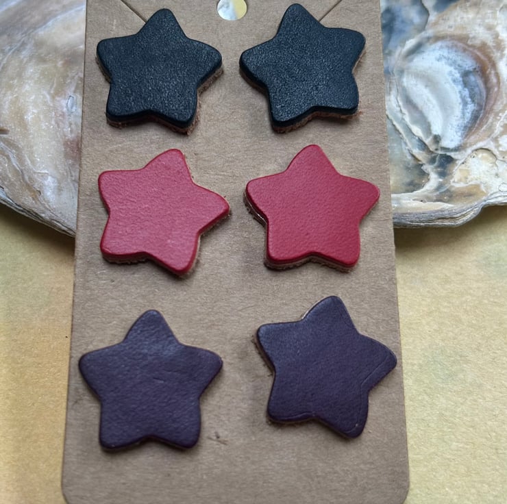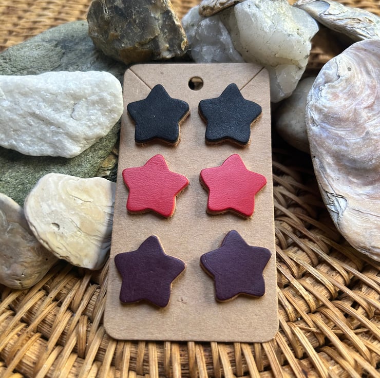Three pairs of leather star earrings in black, red and purple. Made with quality vegetable tanned leathers and backed with an undyed leather to give strength.