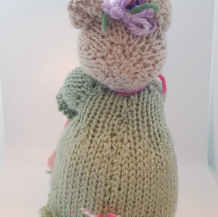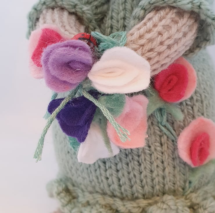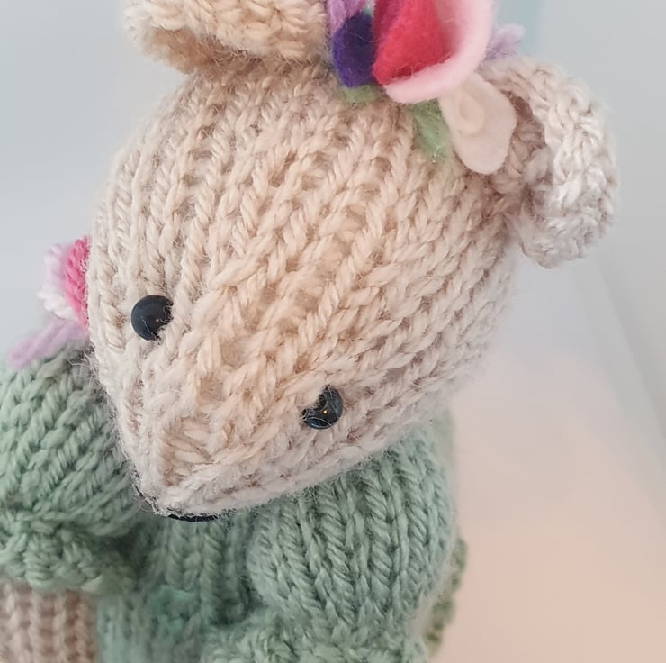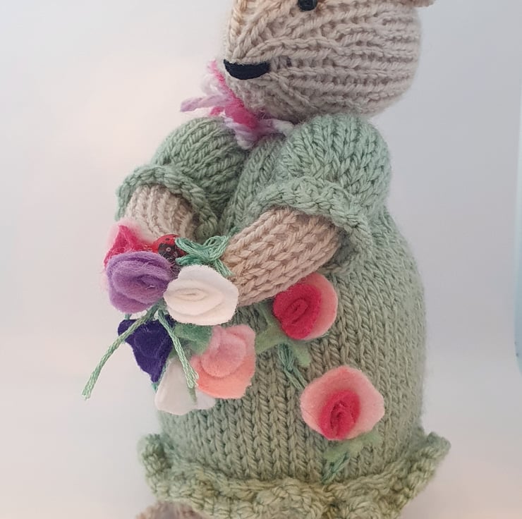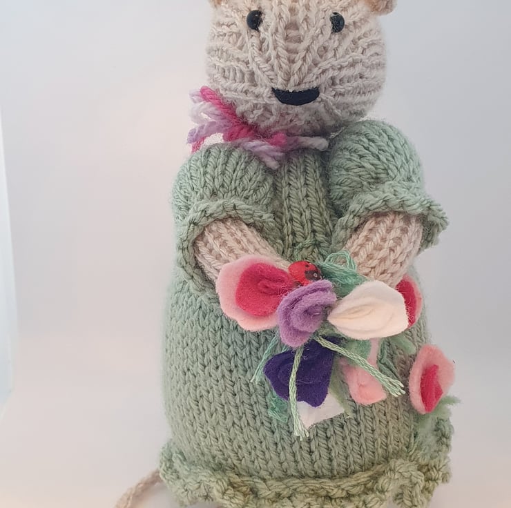 Sweet Pea is a beautiful summer mouse. Dressed in a dress of pale green her skirt has pink sweet peas trailing up. She holds a small posy of different coloured sweet peas, all made from felt.