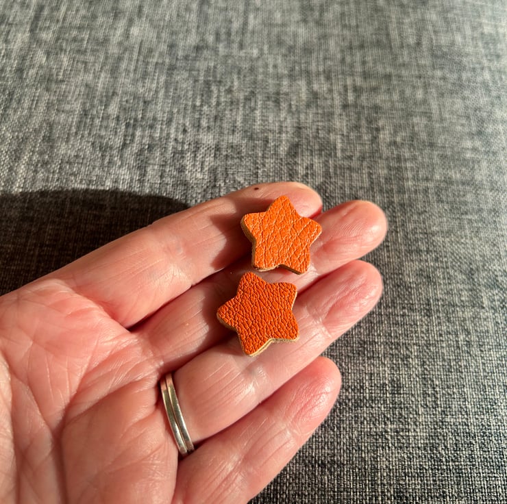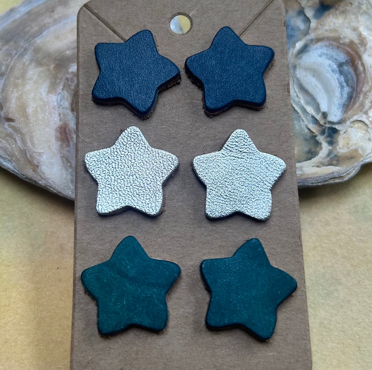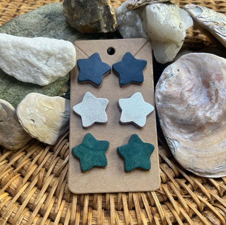 Three pairs of leather star stud earrings. Made with quality vegetable tanned leathers and backed with an undyed leather to give strength.