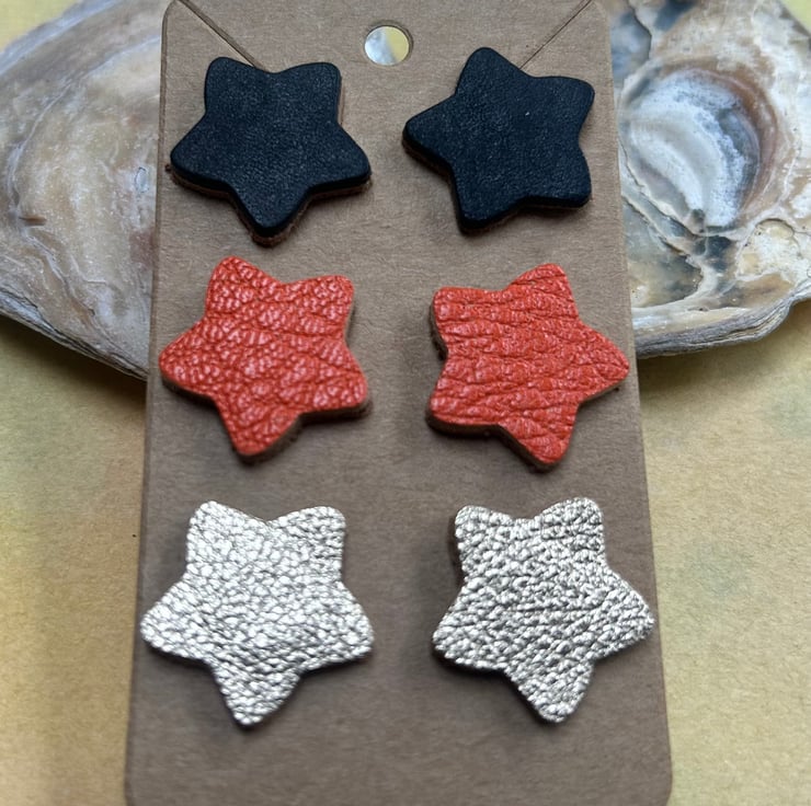 Leather star stud earrings in a set of three. Made with quality vegetable tanned leathers and backed with an undyed leather to give strength.