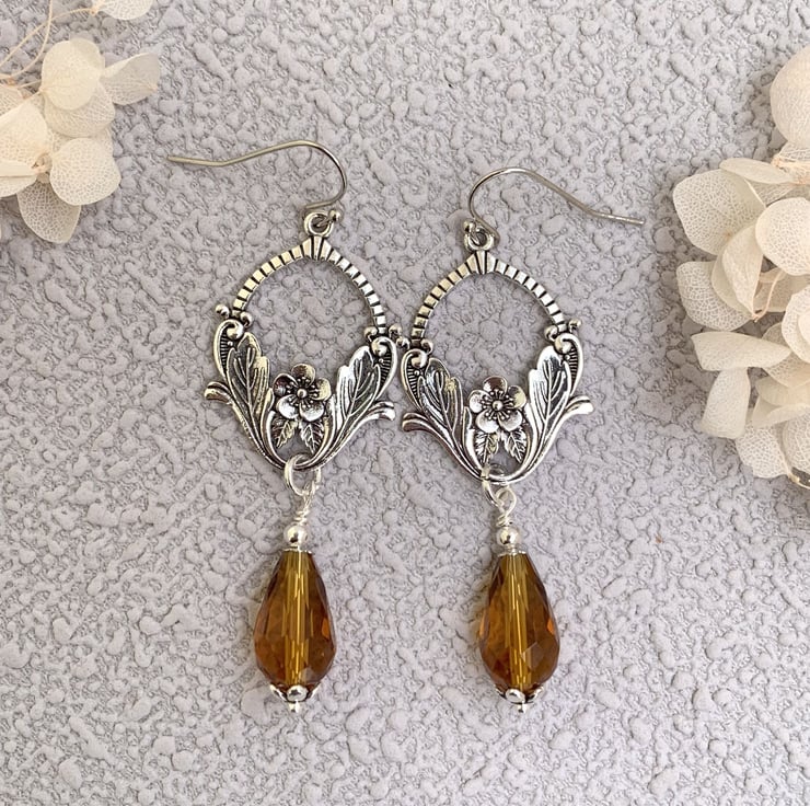 These pretty earrings are made in an Art Nouveau style featuring a really pretty floral silver-plated motif with amber glass drop beads. The earrings are finished with silver-plated ear wires and are 7cm in total length.