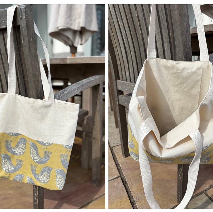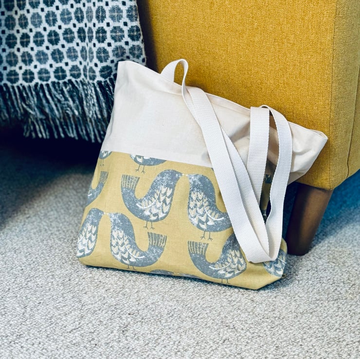 Lovebirds on a mustard coloured cotton fabric adorn the base of this gorgeous tote bag. The upper portion and lining are a complimenting cream cotton fabric.