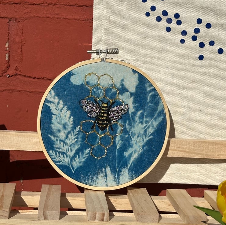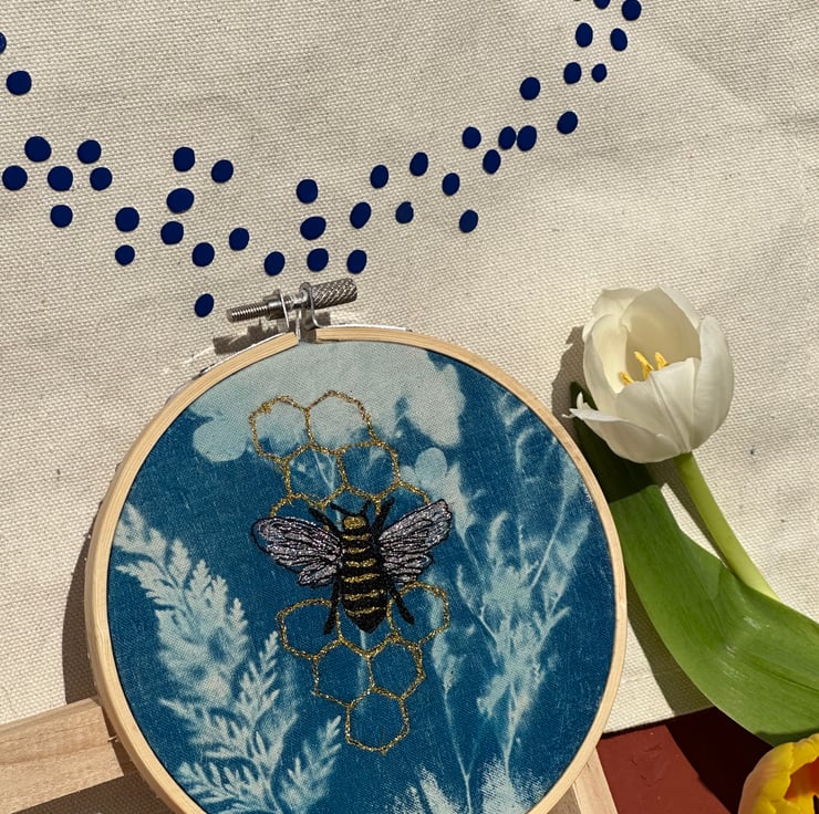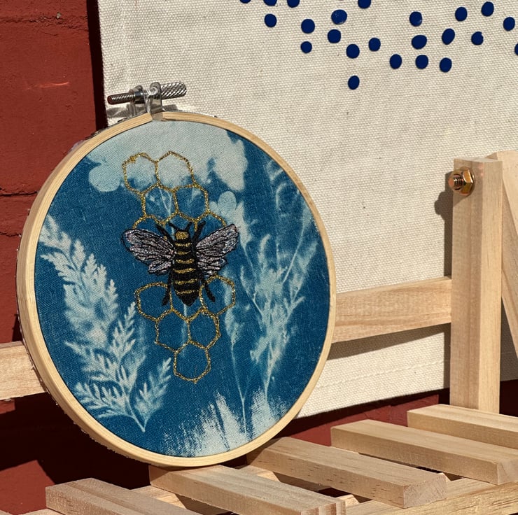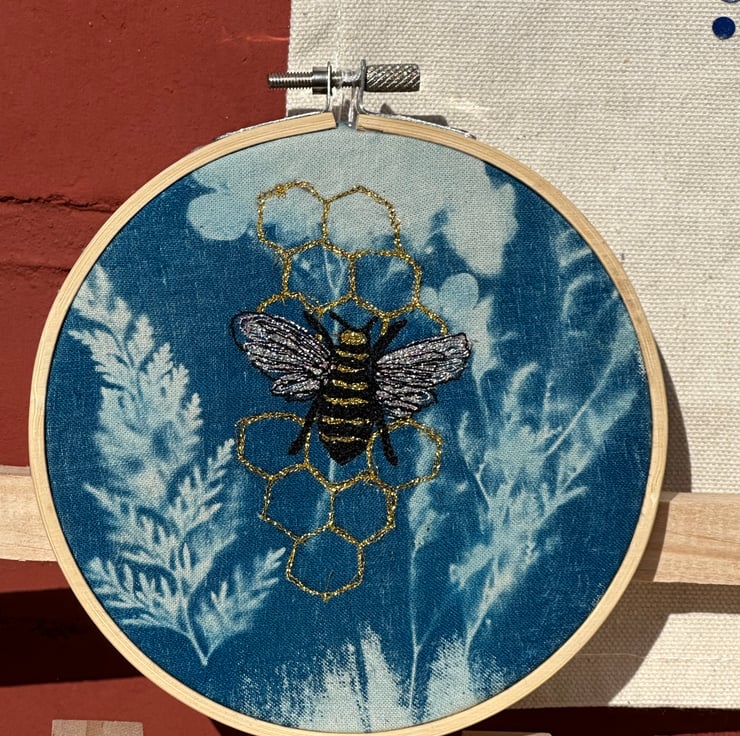 This piece is inspired by the quiet beauty of plants gathered from my garden and local walks. I’m drawn to the delicate shapes of wild botanicals and how cyanotype captures their details in such a soft yet striking way. Embroidering onto the prints allows me to connect even more deeply with the forms — adding texture, movement, and a sense of time. Each hoop is a small reflection of the natural world, stitched with care and a love for slow, mindful making.