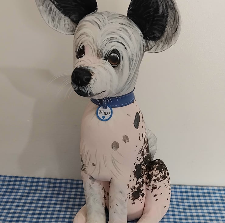 Chinese Crested keepsake is made from heavy duty cotton calico cut from my own hand draw pattern. He is then filled with soft hypoallergenic fibre stuffing and a lined kiln dried sand bag.