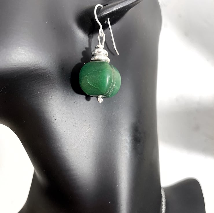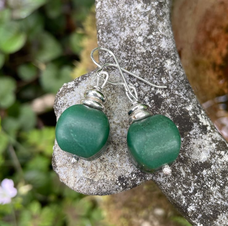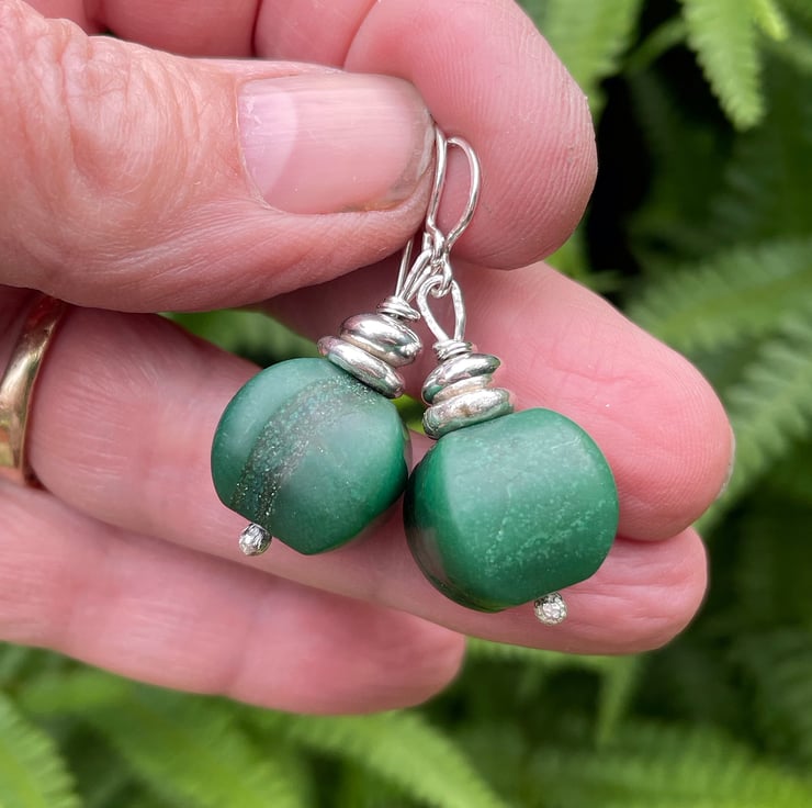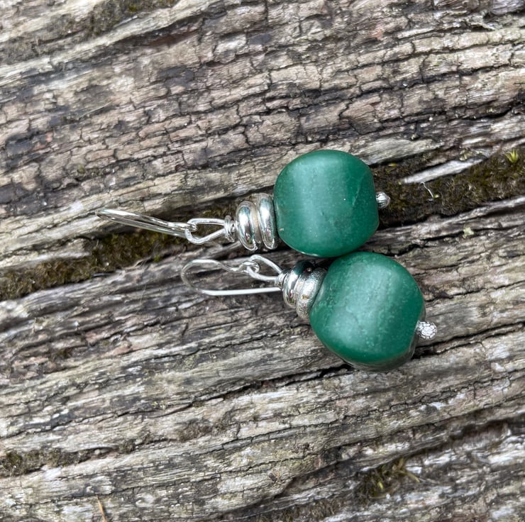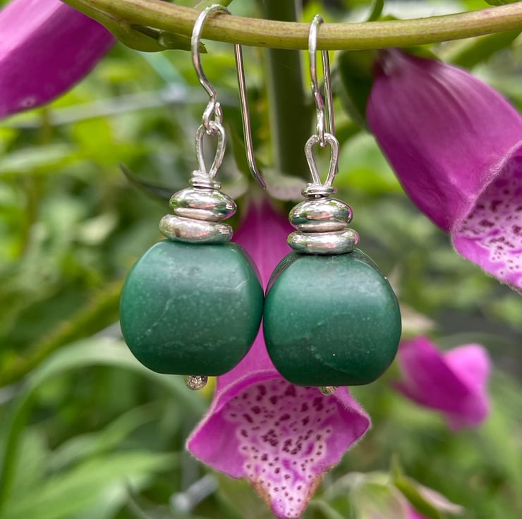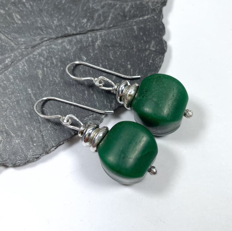 Large shaped beads of dark pine green prasem with a satin finish, topped with a pair of silver beads and hung from handmade hooks.