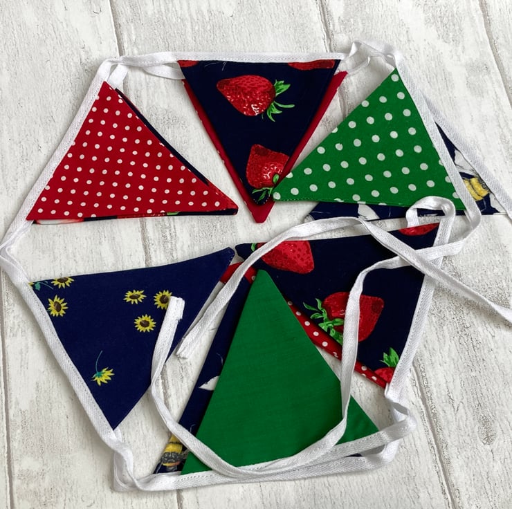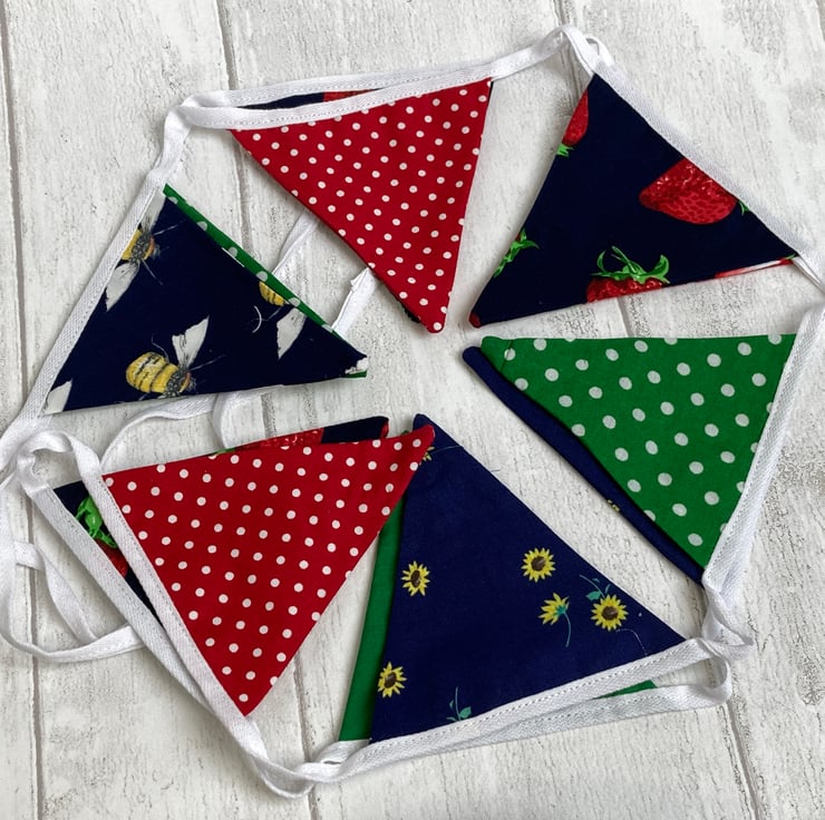 These pieces were perfect to make some striking mini bunting - ideal to decorate a bookshelf, dresser or little alcove. These great fabrics coordinate beautifully in bright shades of red and navy and green. There are lots of dotty spots and a scattering of strawberries, daisies and bees.It would look gorgeous in a kitchen or garden room.