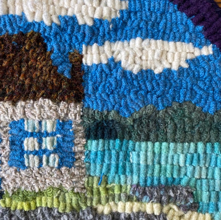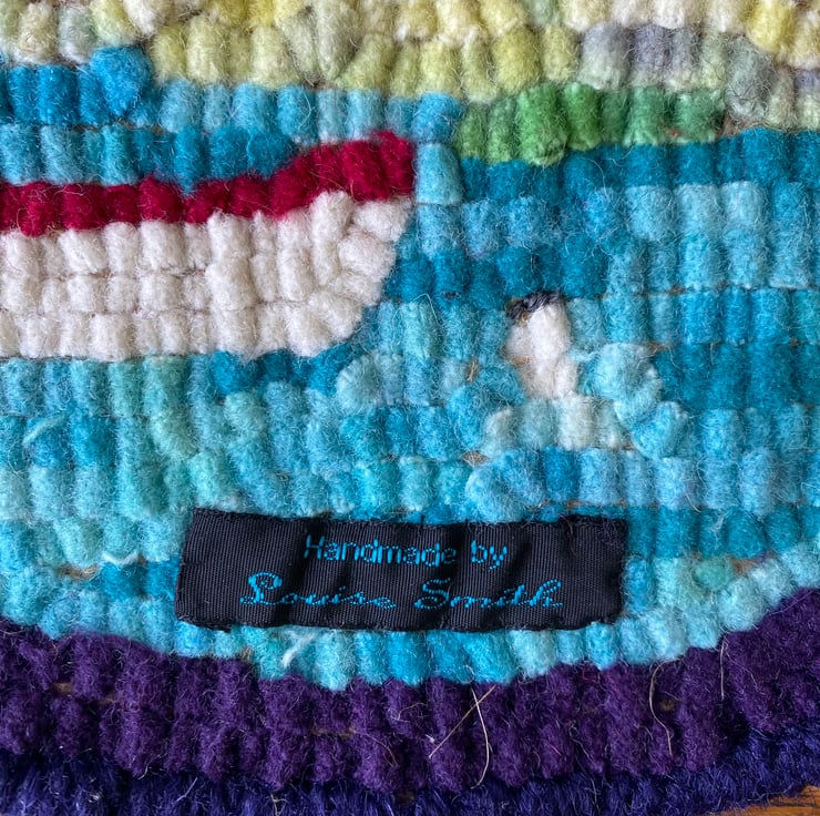 The wall hanging is created using a traditional rug making technique known as 'Hooky' in the North East of England. Strips of wool are hooked through a hessian base to produce a colourful and vibrant piece. The hand whipped edge provides a neat and robust finish.