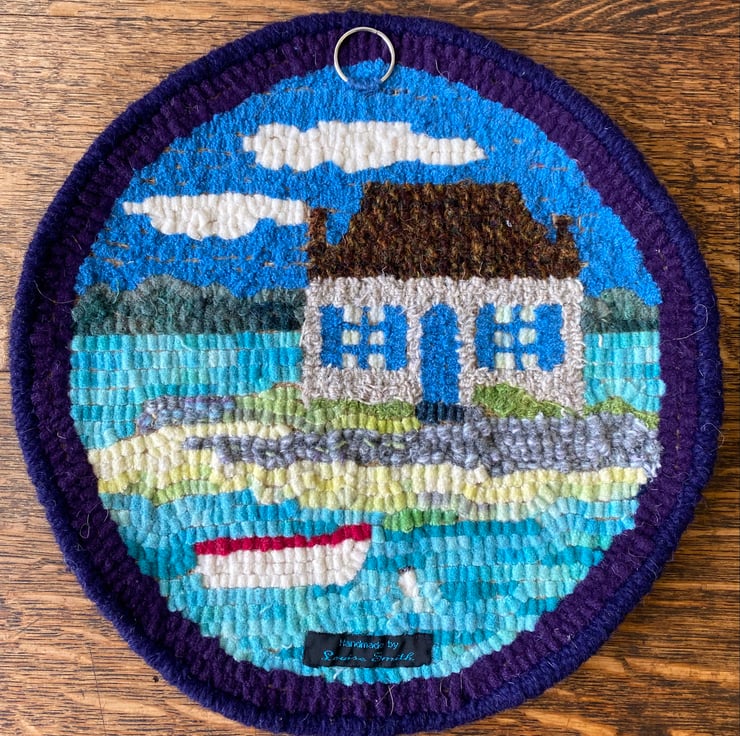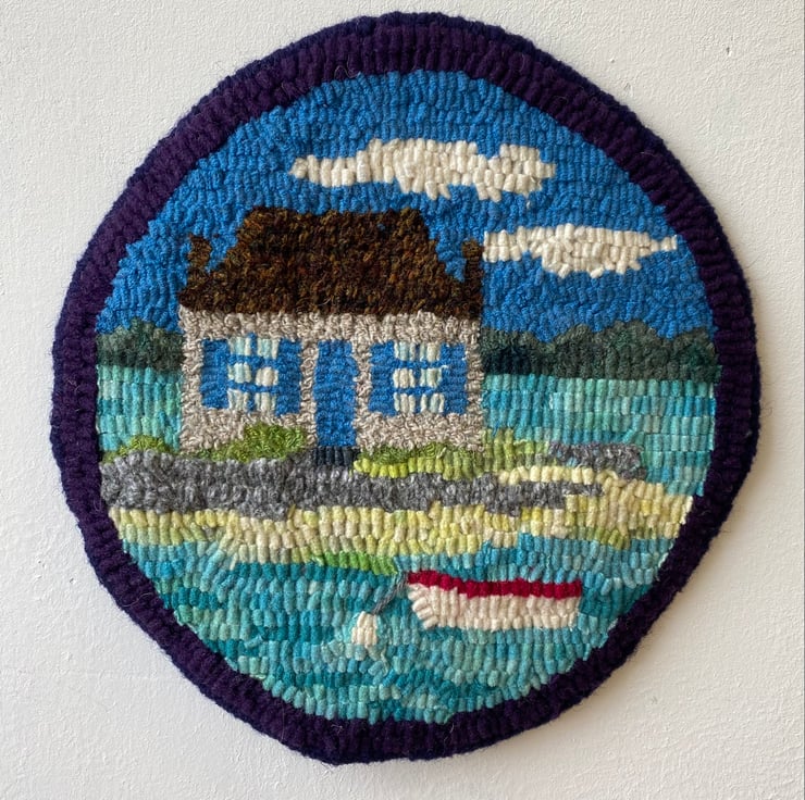 'La Petite Maison aux Volets Blue' can be found in the estuary near St Cado in Brittany, France. Inspiration for artists over time, this wall hanging is my own offering of the little house with the blue shutters. Made using a mixture of recycled and new wool with a little bit of Harris Tweed also thrown into the mix.