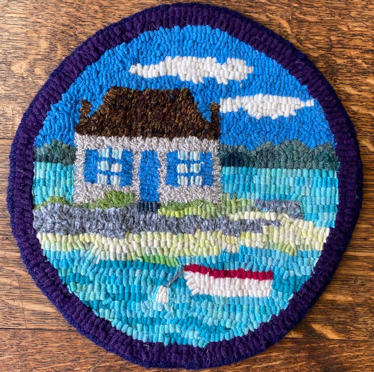 I had the idea whilst working on a circular frame for a series of mats that I mentally labelled ‘Up Periscope’. I love the idea that a periscope could pop up out if any body of water, at any place in the world and take a snapshot of what it saw. The pieces in this series whilst not necessarily being true representations of a particular place are inspired by real life places and sometimes combinations of different places.