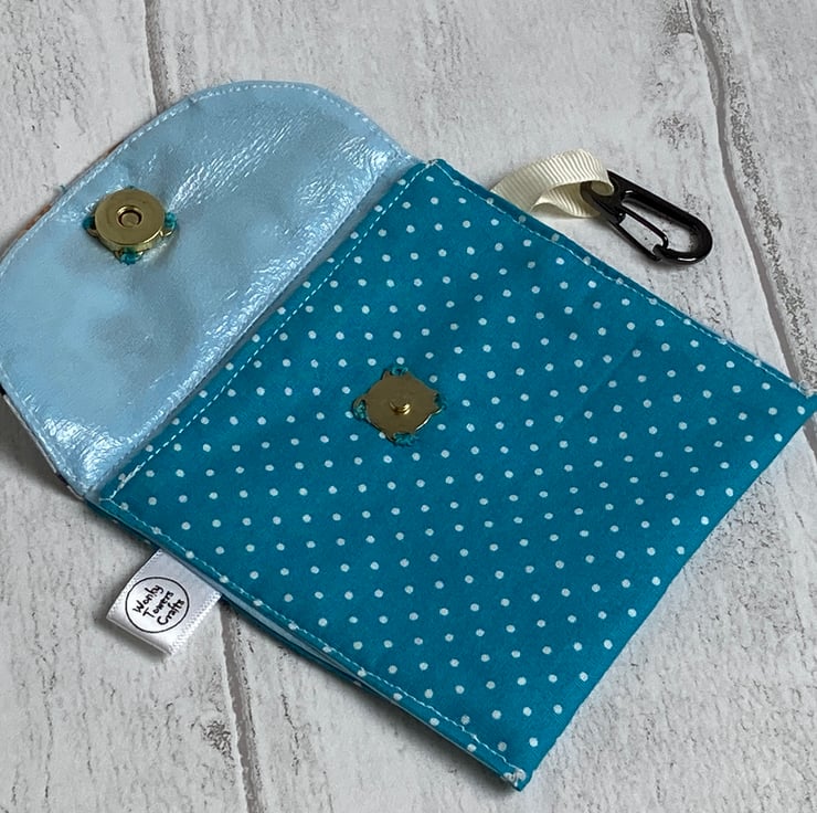 This treat pouch is made from turquoise polka dot fabric with a dog-design flap. The lining is blue. The whole thing is washable in the machine or you can just wipe the lining clean. It coordinates beautifully with some of our other products.
