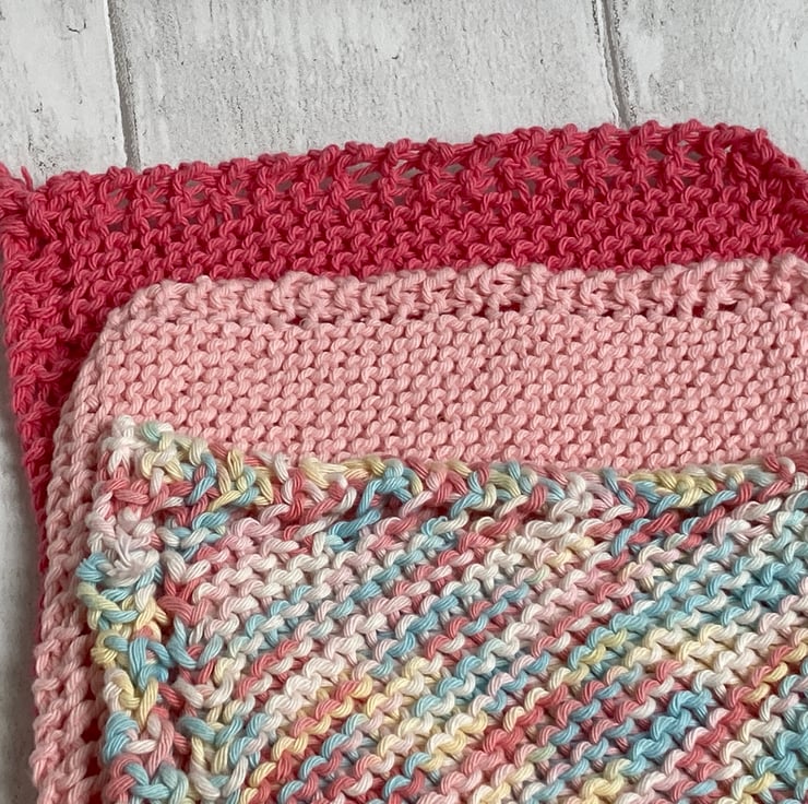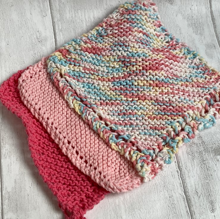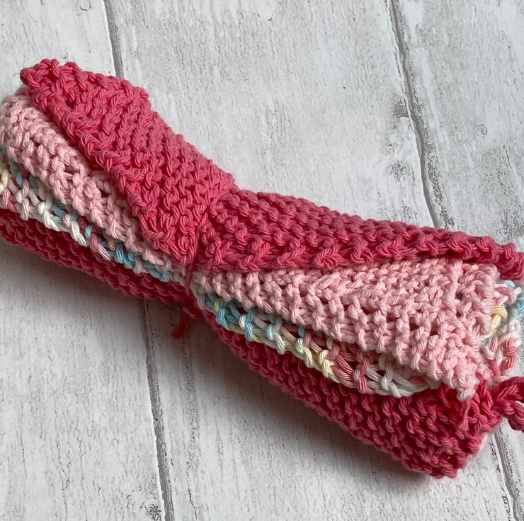 If you’re looking to change your washing up regime, these lovely dishcloths are certainly worth a try. The hand knitted squares are made from strong cotton yarn in coordinating colours. One pale pink, one dark pink and one variegated pinks. In fact you might think they are too pretty for the kitchen, in which case they are soft and perfect as face flannels.