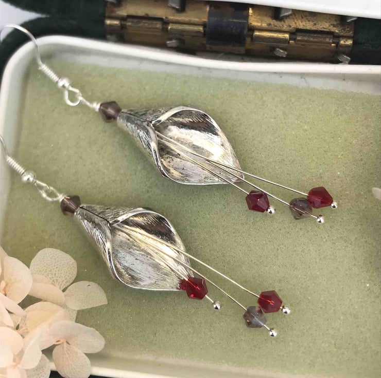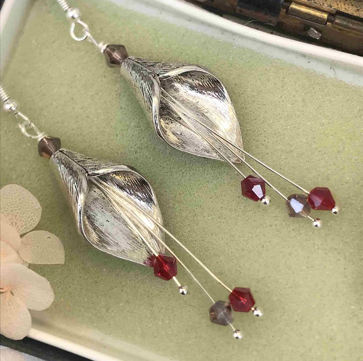 These charming earrings are made with silver calla lily flower beads and they have long silver-plated drop stamens with tiny red colour glass crystal beads. The stamens move when the earrings are worn which adds to the charm of these earrings. They are finished with silver plated ear wires and are 7cm in total length.