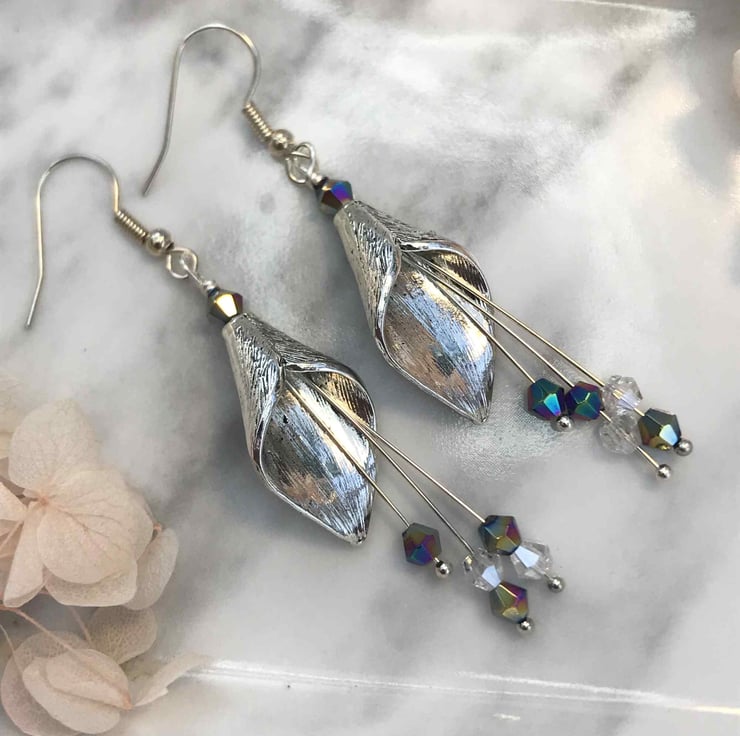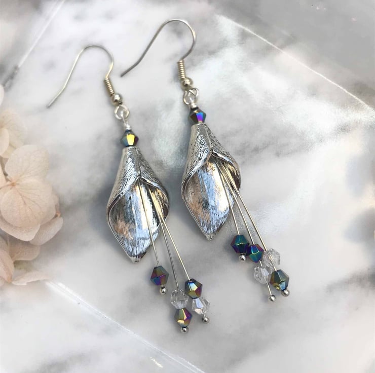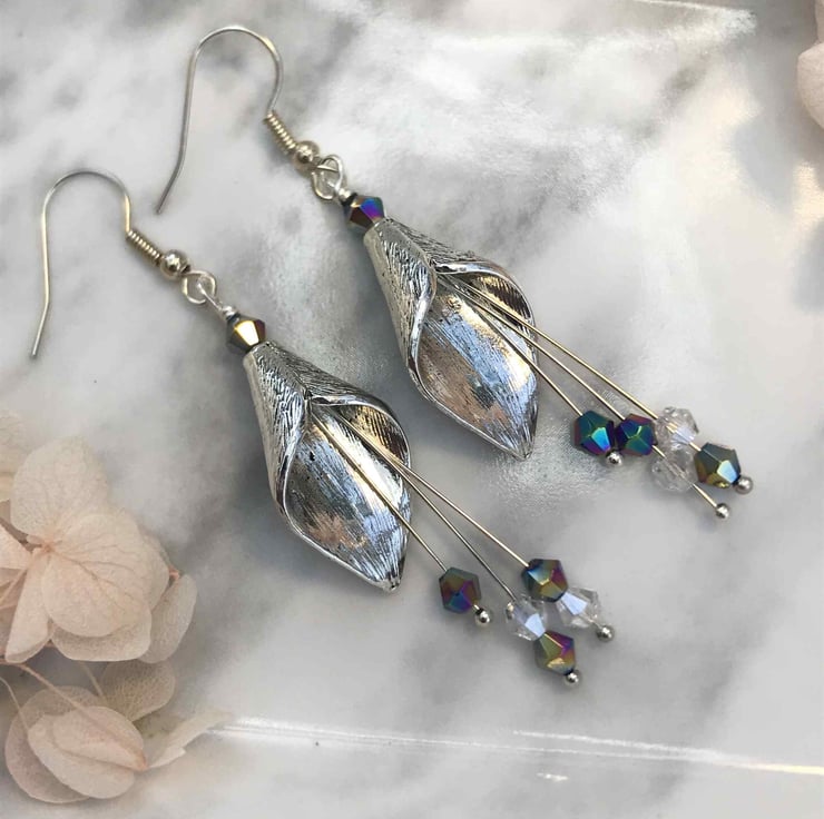 These charming earrings are made with silver calla lily flower beads and they have long silver-plated drop stamens with tiny mixed colour glass crystal beads. The stamens move when the earrings are worn which adds to the charm of these earrings. They are finished with silver plated ear wires and are 7cm in total length.