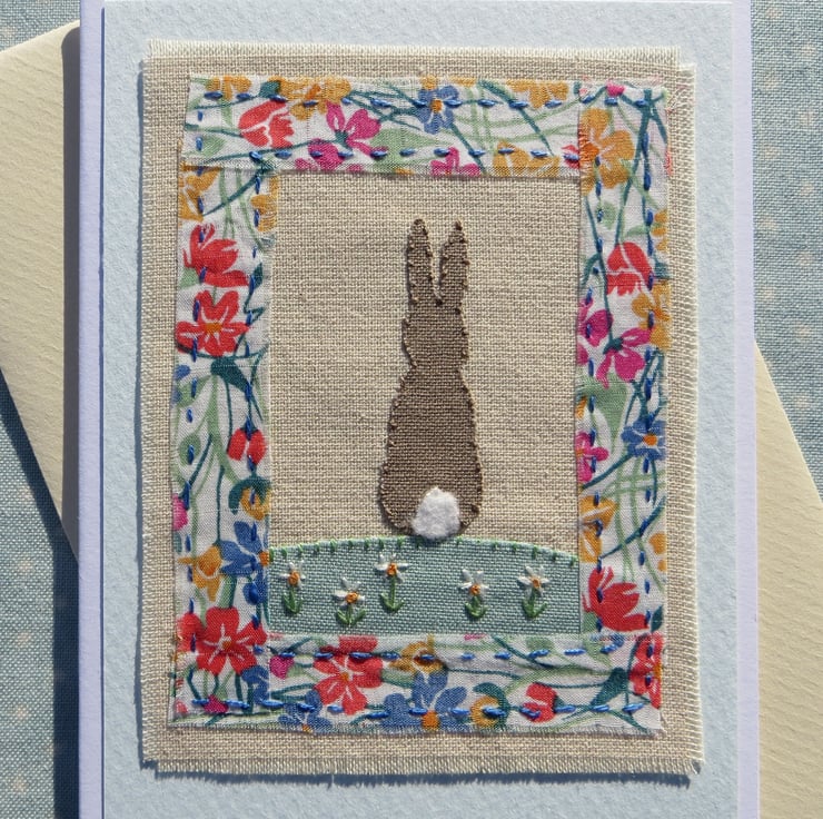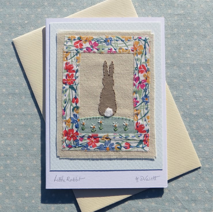 I love to stitch cards for children, and this little rabbit design has been popular for quite a few years now. I have made his tail from a fluffy piece of wadding fabric and embroidered the daisies in fine white silk.