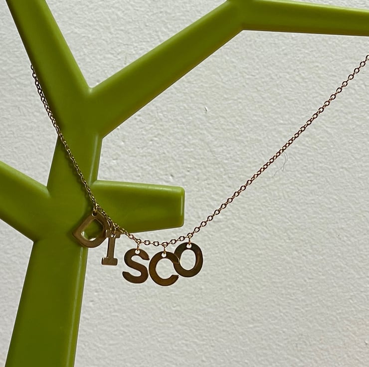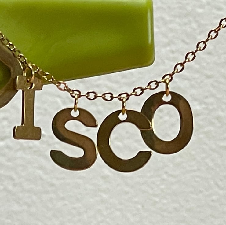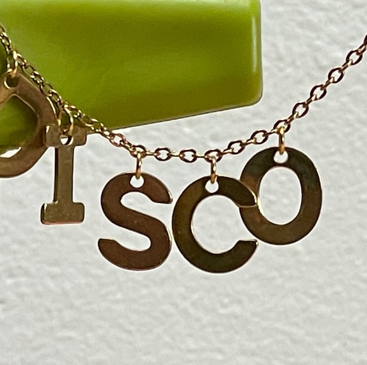 The necklace is gold plated brass and the letters are gold plated brass. Now THAT'S disco.