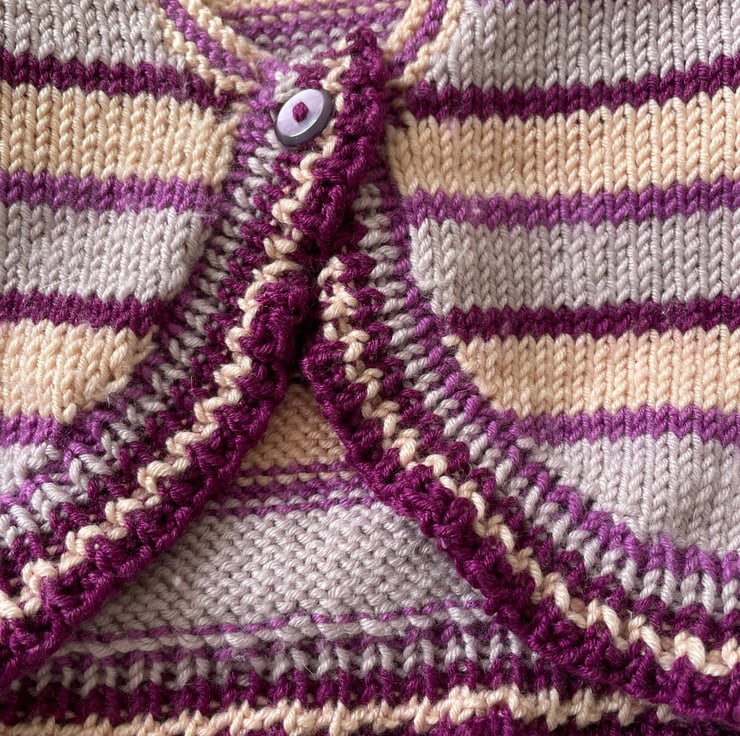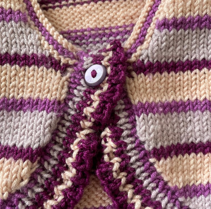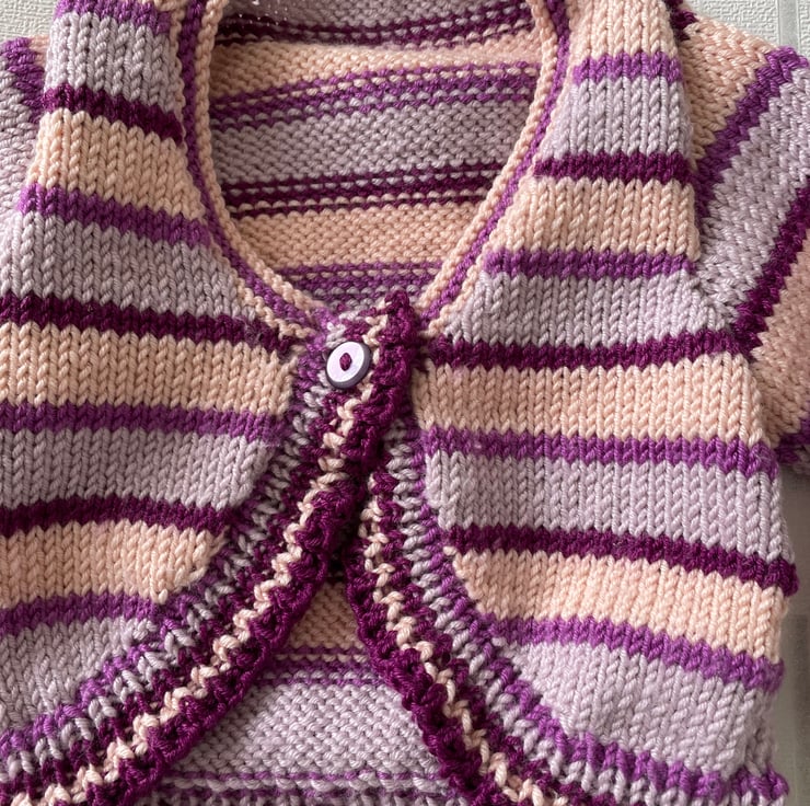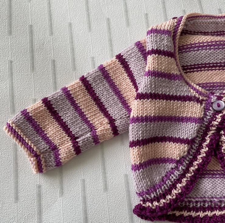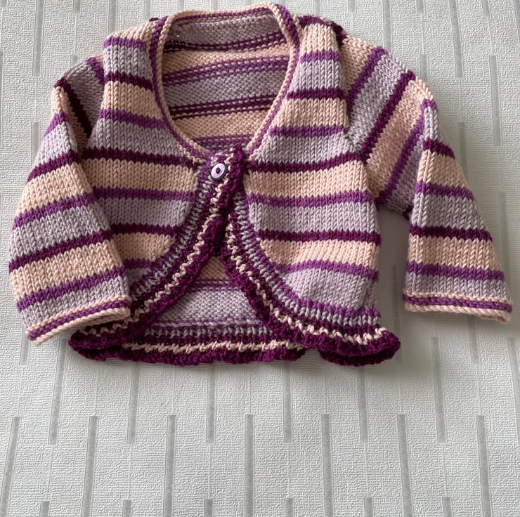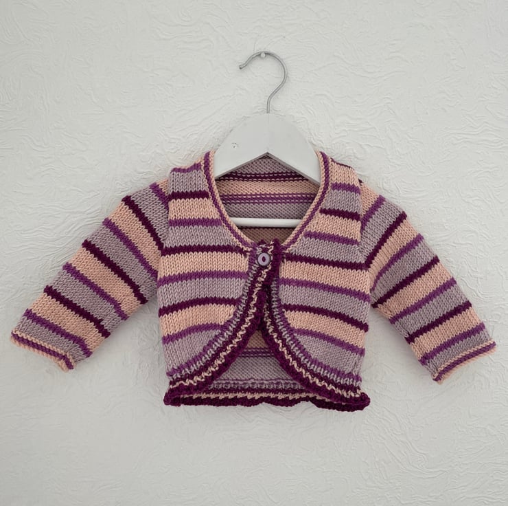 Striped long sleeved baby bolero knitted in a luxury yarn
