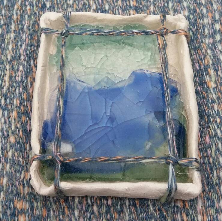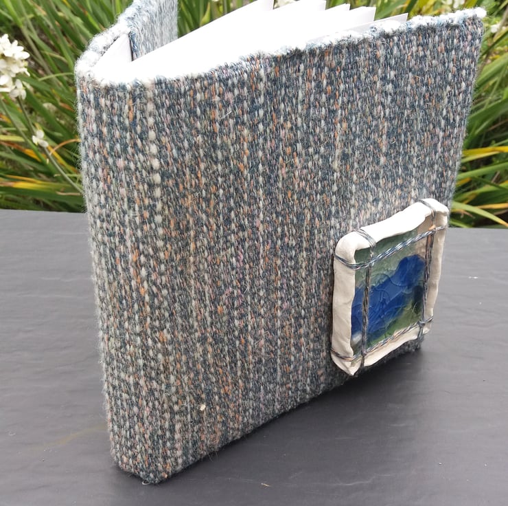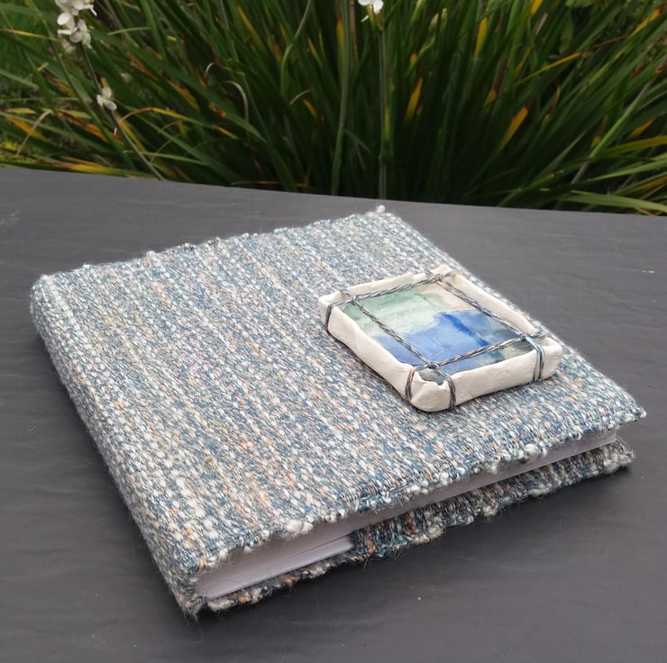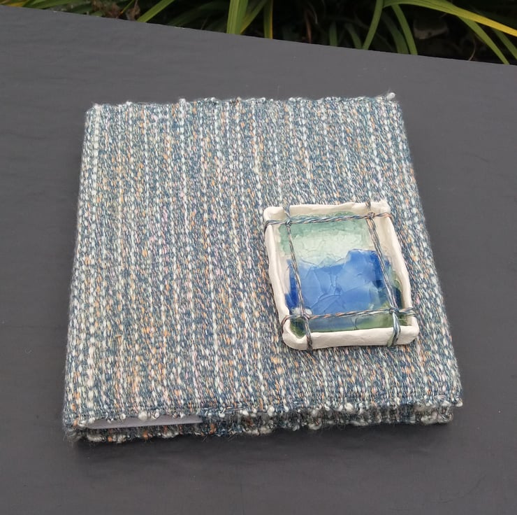 Handwoven slip cover in wool, with a seaglass and ceramic feature on the front, the book inside is 90 pages and can be used for journalling or a sketchbook. 20cn w x 21cm high x 3cm deep