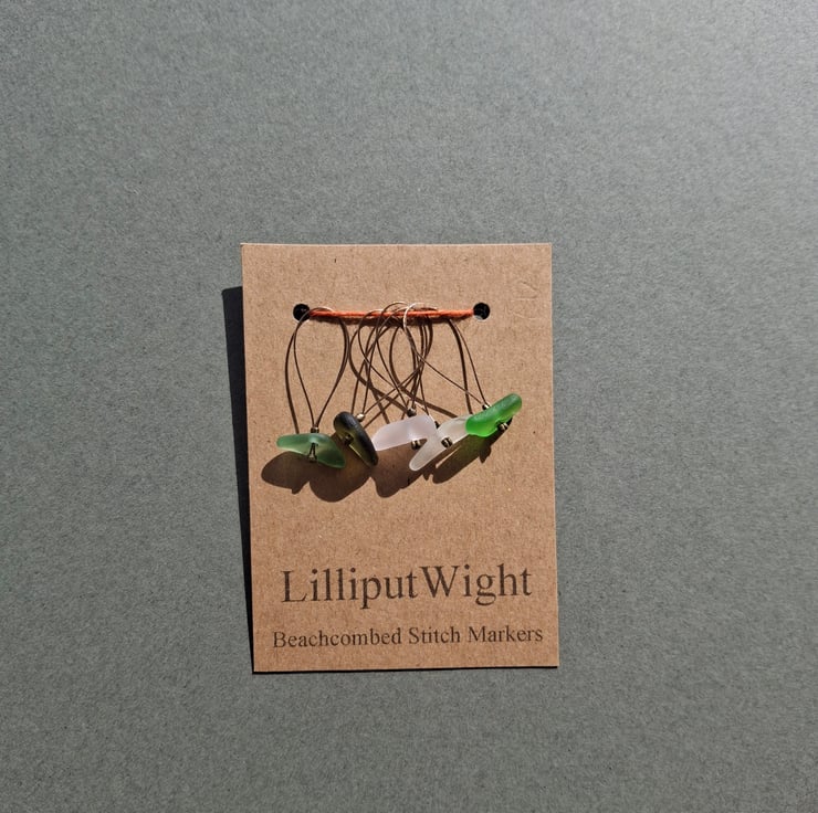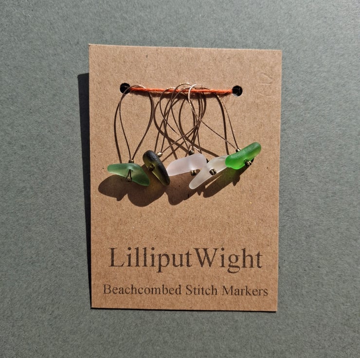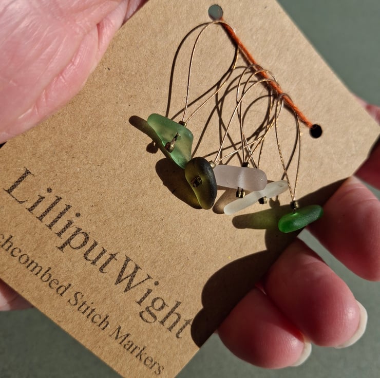 A set of five sea glass stitch markers in shades of green and white. The sea glass is all genuine and has been collected from beaches close to my home on the Isle of Wight.