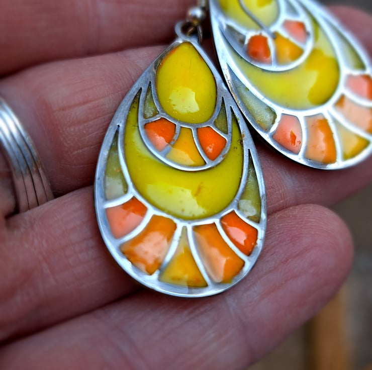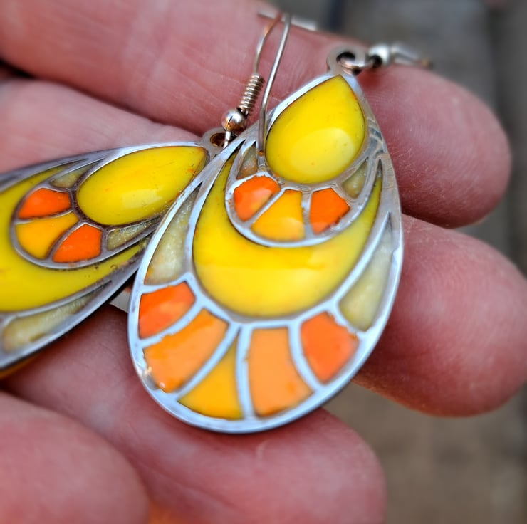 Handmade pair of vibrant yellow, orange and tangerine polymer clay in a silver plated bezel. Coated with a layer of resin.