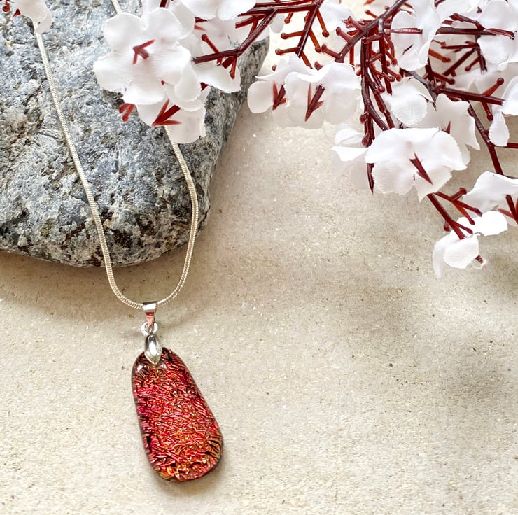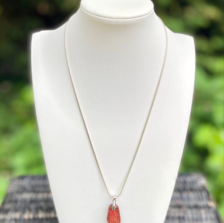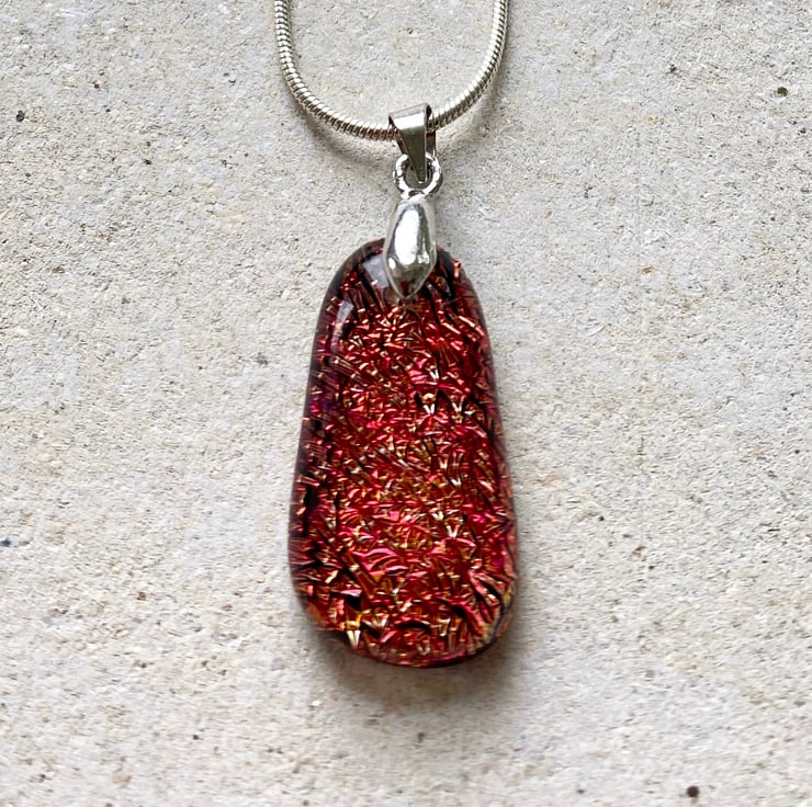 This fused glass pendant is packed with fiery sparkle in tones of deep red, orange and gold. The textured surface catches the light beautifully, making it look almost molten. A proper statement piece if you like a bit of drama in your jewellery!