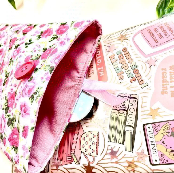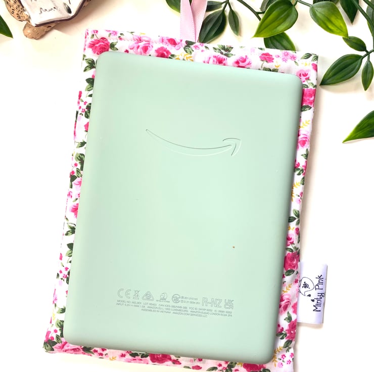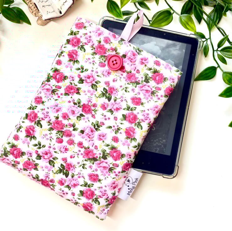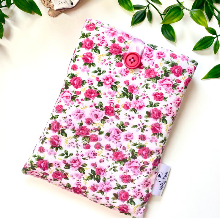 Handmade pink floral padded kindle sleeve / e reader case. It has a pink cotton lining. This lovely fabric sleeve has been made to fit various sizes of kindles, please see below.