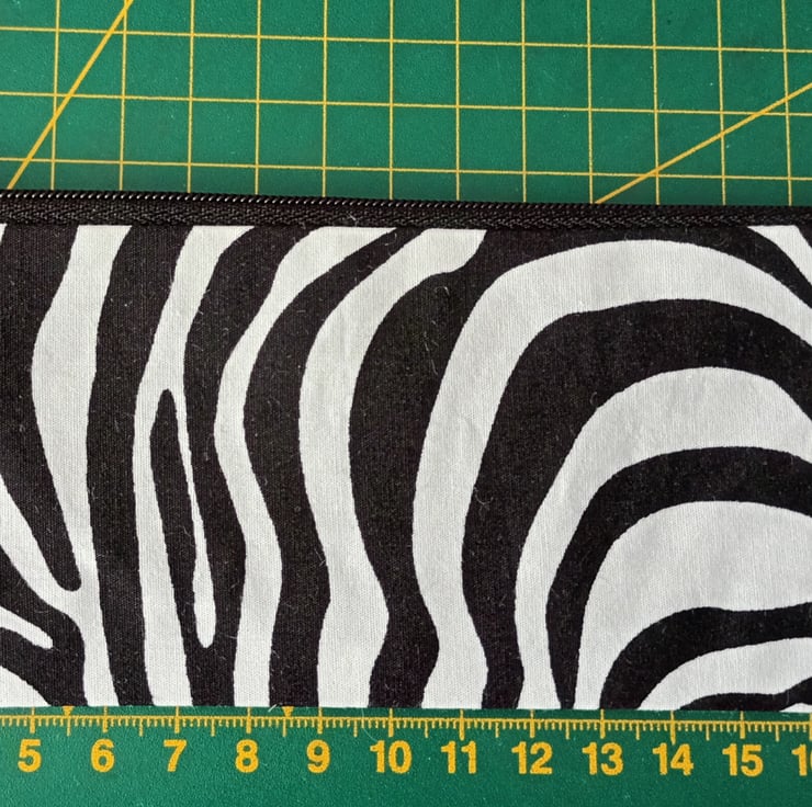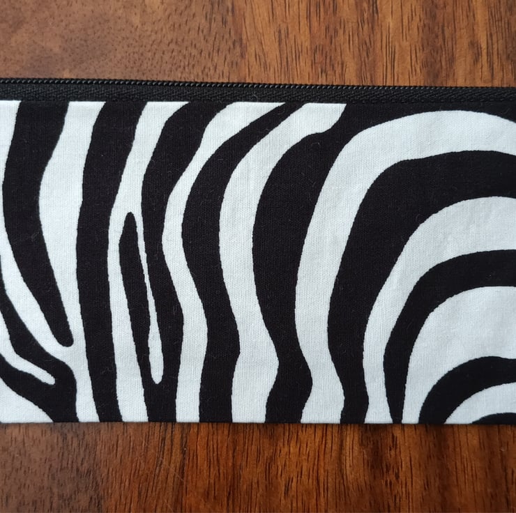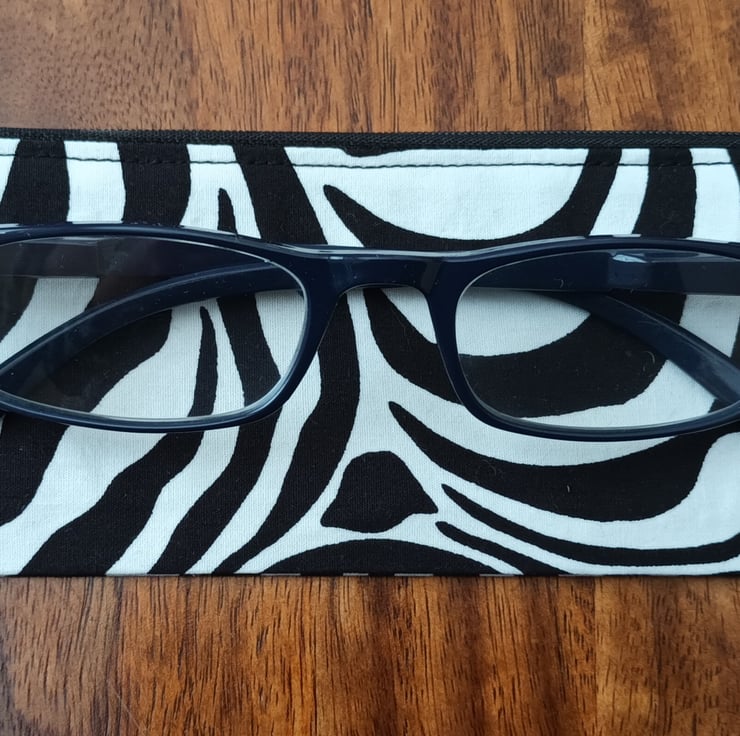 A lovely unisex zipped glasses case with a zebra print design in black and white. Can also be used as a small pencil case or makeup bag. 100% cotton outer and also lined with 100% cotton.