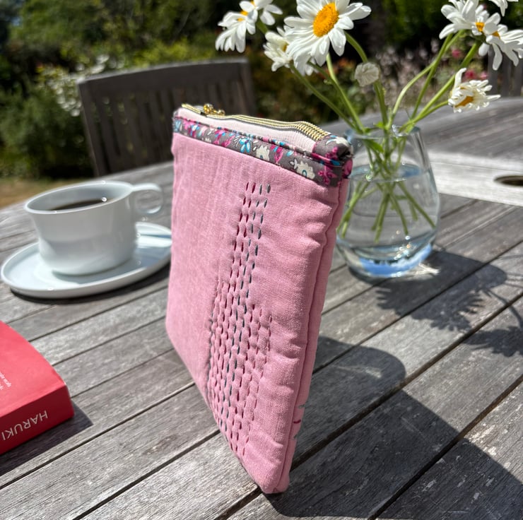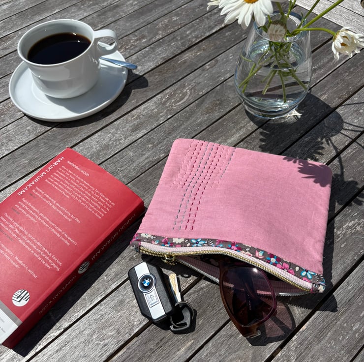Made from a cotton fabric with handstitched line detail in shades of pink and blue. The handstitched detail in the front runs top to bottom and on the reverse it runs side to side. The purse is lined with a lovely floral cotton and closed with a pale pink zip with gold coloured zip pull.