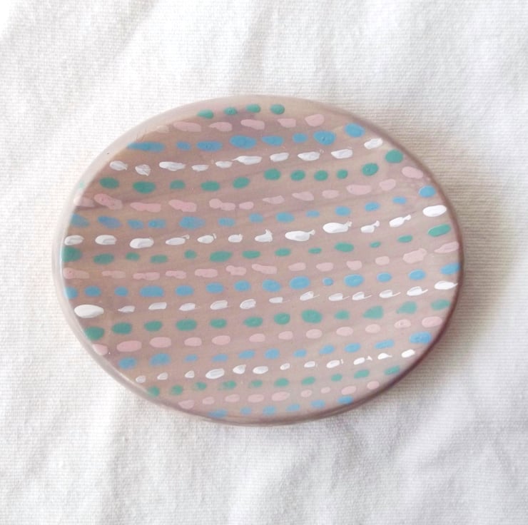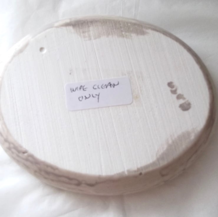 I was given two of the trinket / soap / pin dishes by a potter friend of mine (I have decorated one in pastel green with a similar pattern). They were plain with no glazing, so I purchased some ceramic paints in a chalk paint style which was different to others and decided to paint them in a decorative way. They are quite chunky and solid and have a lovely soft curved edge, so I wanted to paint them in a pretty, simple decorative pattern.