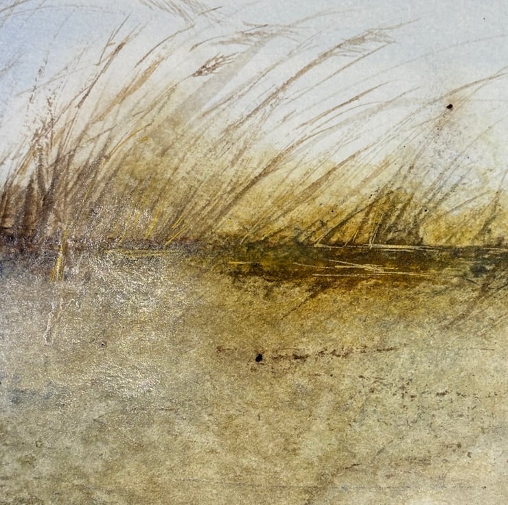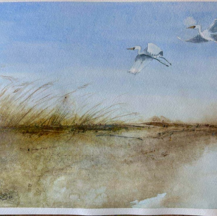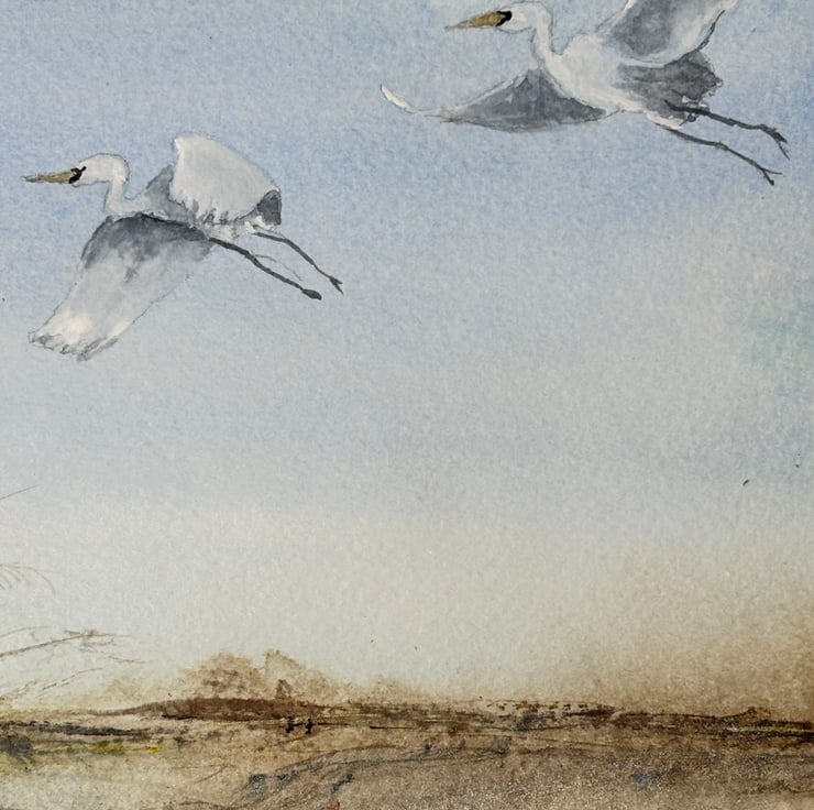 Egrets fly over the edge of the marsh. This stunningly loose and elegant watercolour original captures the light and beauty of the open space. It has some metallic watercolour paint in leaving a sheen and sparkle that draws the eye.