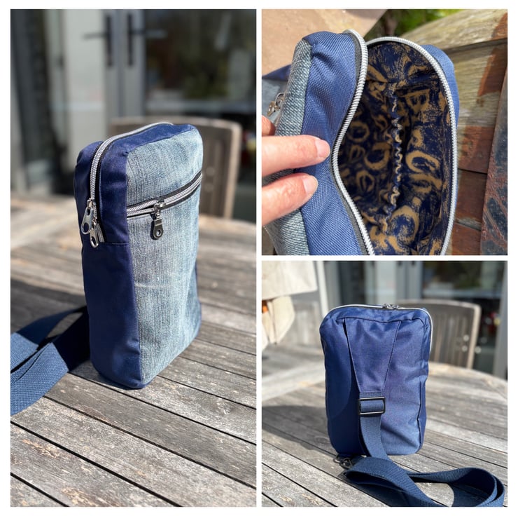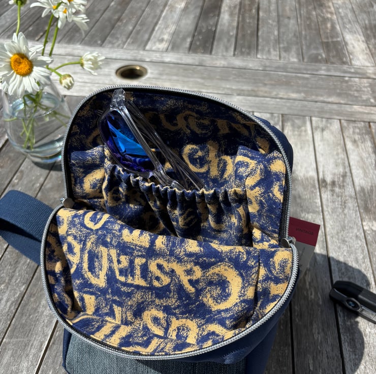 The exterior is predominantly made from a waterproof canvas, with an up-cycled denim contrast for the pocket. The bag is lined with a blue / sand coloured cotton fabric, and there is an internal slip pocket with an elasticated top - great to keep your phone or keys easily available.