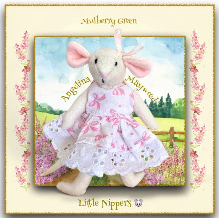 Angelina Mayweed, dressed in a pink and white bow print dress, trimmed with broderie anglais, is one of the Little Nippers - tiny mice who live in a maze of tunnels underneath the barn at Mulberry Farm. All of the Little Nippers are named after herbs and meadow flowers. The Little Nippers are 14cm tall. Clothes made especially to fit them are also available in my shop.