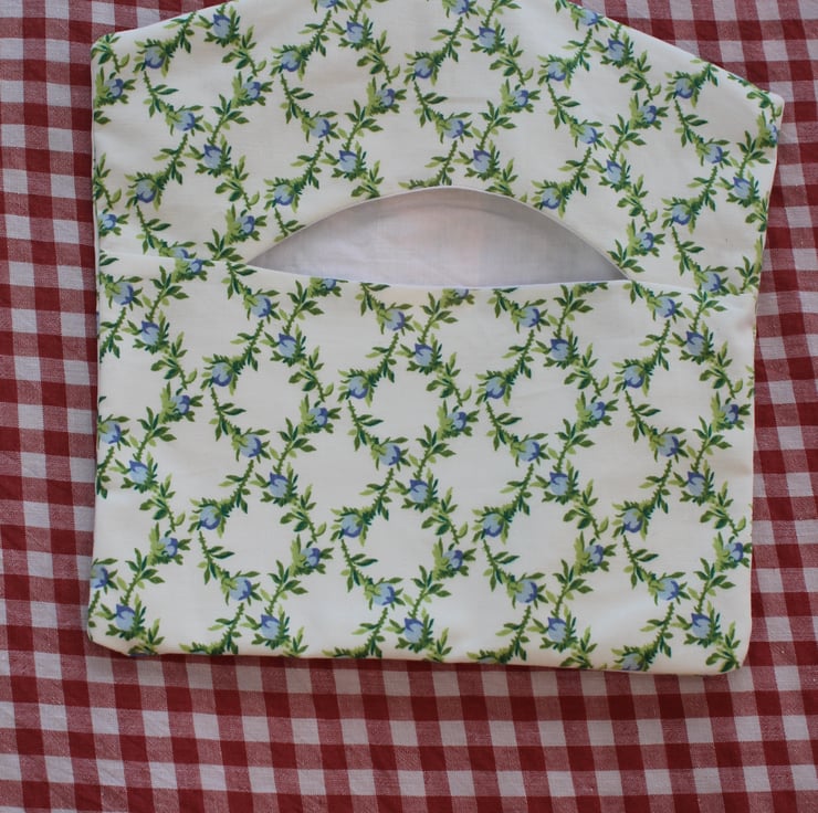 A vintage style peg bag made from Sanderson 'Fianne' fabric featuring a trellis pattern of rose buds in shades of blues and greens set upon a cream background. It is lined with vintage white linen sheeting.