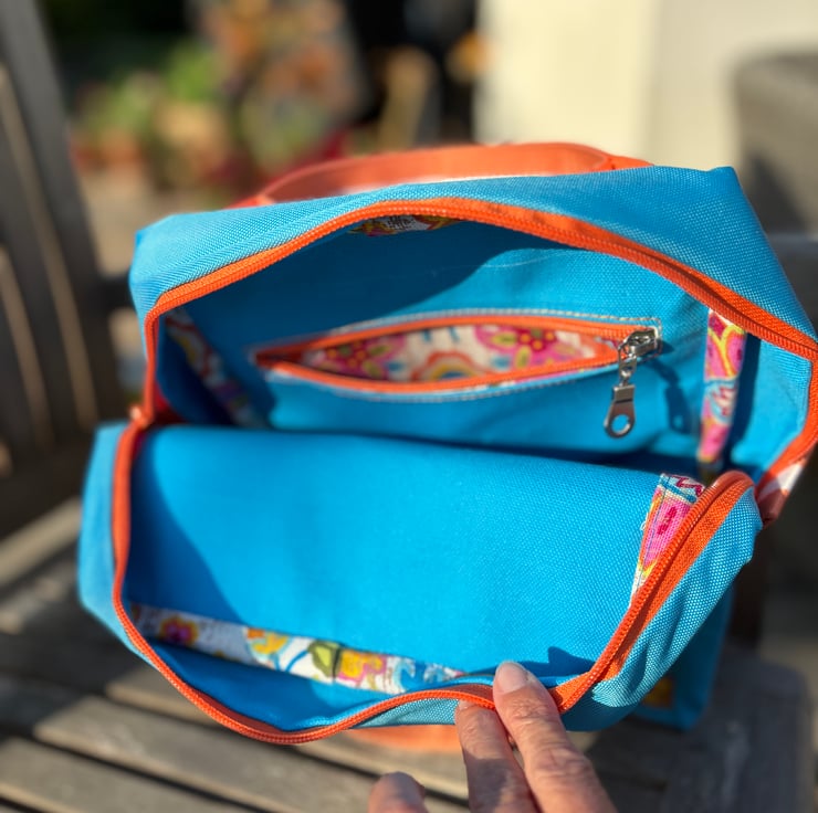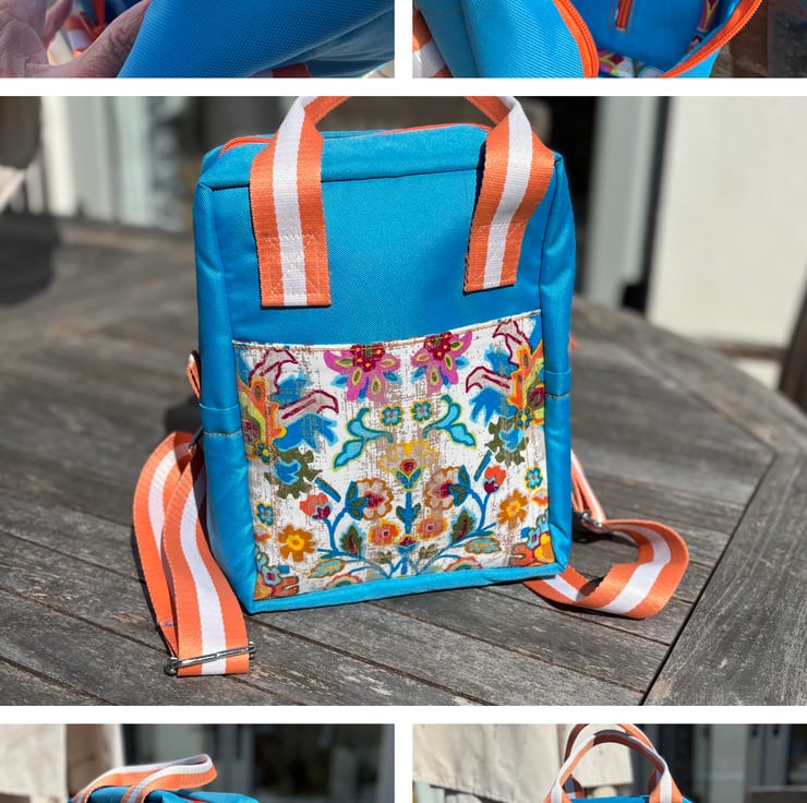 The exterior is predominantly a lovely sky blue waterproof canvas, with a vibrant floral cotton fabric for the front slip pocket.