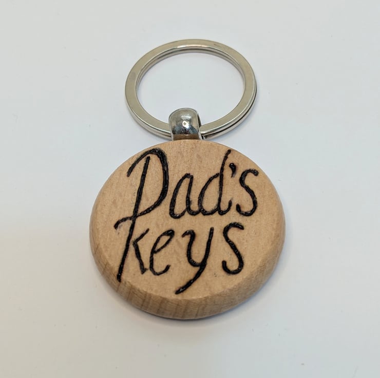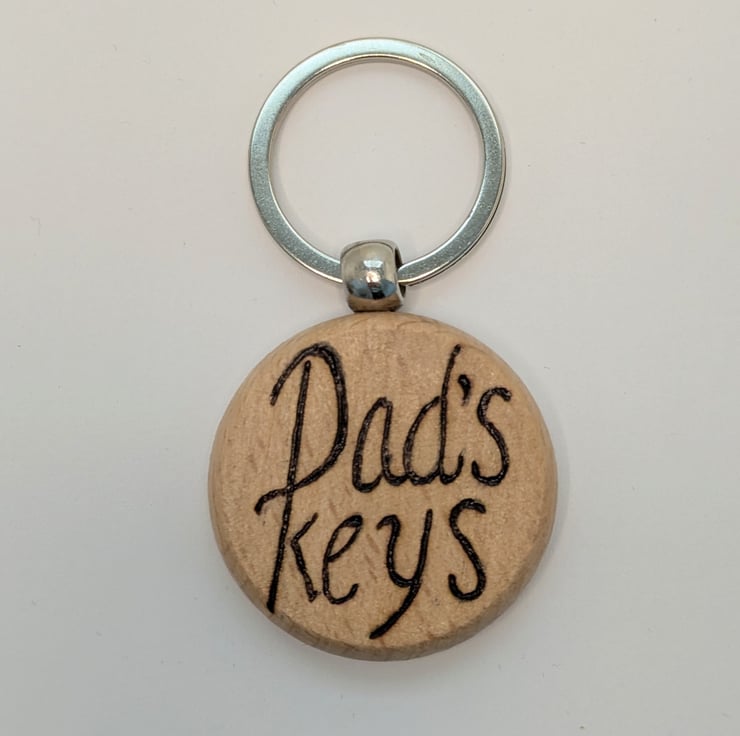 Round wooden keyring which has been lovingly handburnt with the words "Dad's Keys, using the art of pyrography. This solid keyring has then been varnished for extra protection.
