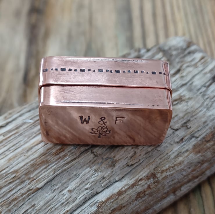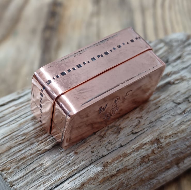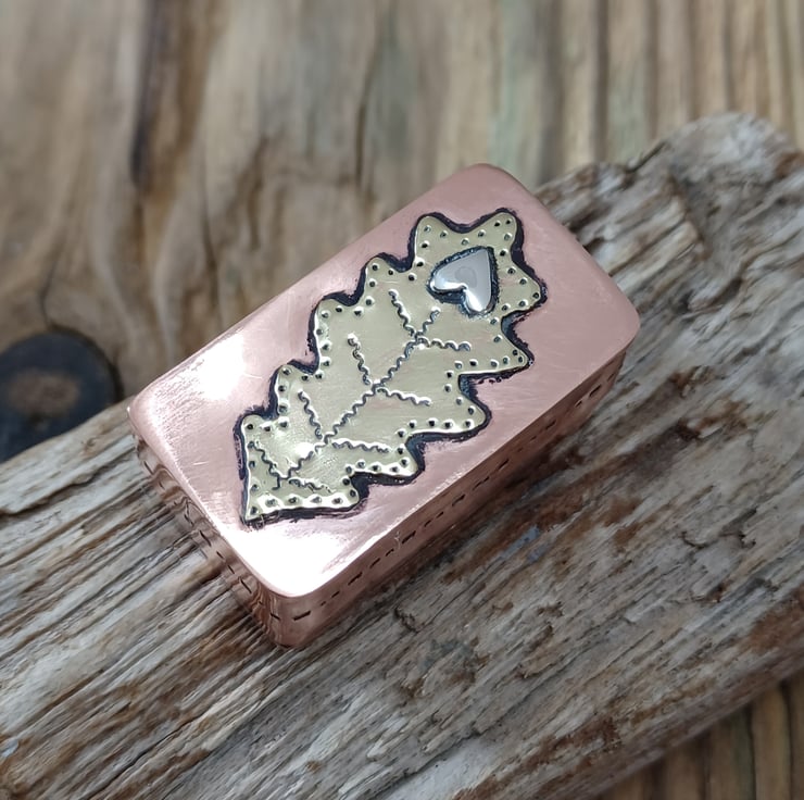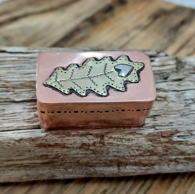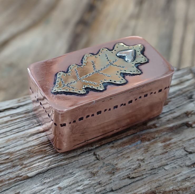 Made from copper, brass and silver sheet . This delightful mini box could be a place to store any little keepsakes or just as a collectable. It has been hand sawn, soldered ,filed , sanded and polished. A stylised brass oak leaf has been soldered to the lid , and metal punches used to texture the top and sides.