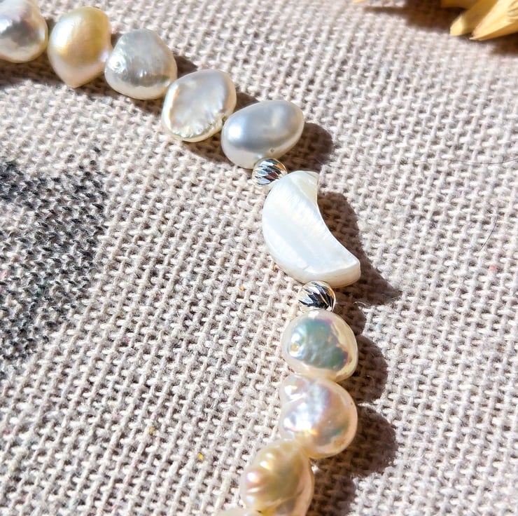 This dreamy, one-of-a-kind bracelet features twinkly 3mm ‘Moon-cut’ sterling silver beads, creamy ivory Baroque Freshwater Pearls, and a beautiful, celestial hand-carved Mother of Pearl Crescent Moon charm at the centre.