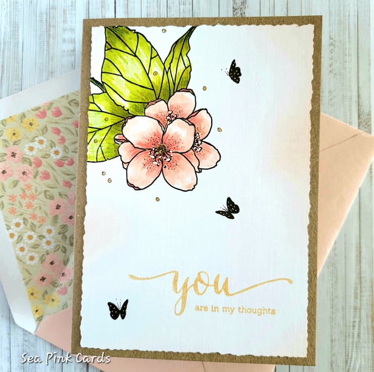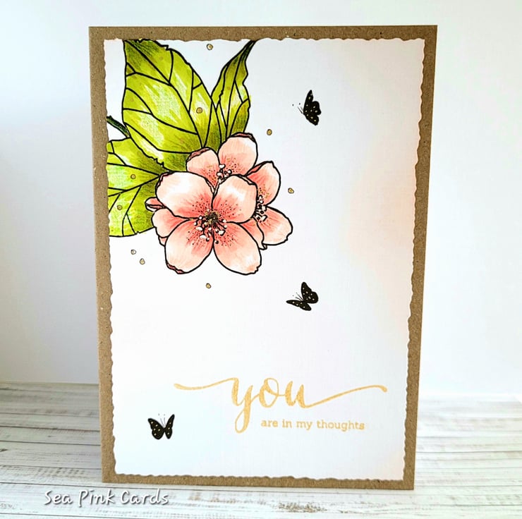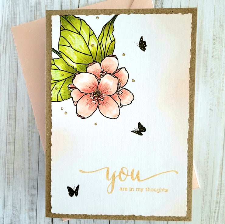 A beautiful handmade thinking of you card with a simple, unfussy design. The focal image is of a floral stem with three tiny butterflies. There is a sentiment which reads, you are in my thoughts. This card is 10.5 x 15 cms and has been individually stamped by hand. The image is also coloured by hand, using peach and green graphic art pens and pencils. The sentiment has been stamped with subtle gold metallic waterbased ink.
