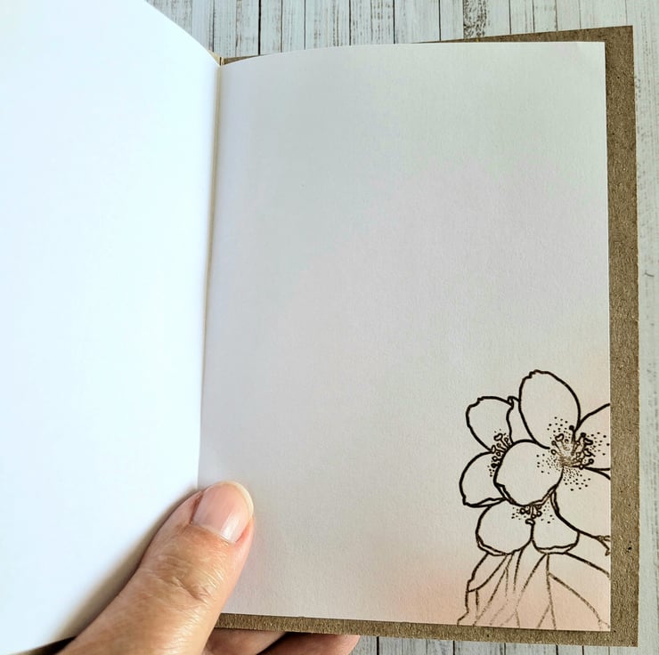 The layered design is made from 100% recycled brown kraft card, white lightly textured card and white paper (insert). Details have been added with gold, brown and white fineliner pens. The inside is blank, making the card suitable for writing a personal message. There is a matching stamped image on the white insert on the inside. Comes supplied with a premium quality coloured envelope with a floral paper liner.