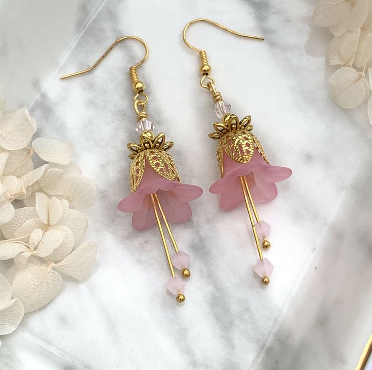 These charming pink flower earrings are made with pink lucite flower beads that are topped with gold petal shaped bead caps and additional gold flower bead caps. The earrings also have long gold-plated drop stamens with tiny pale pink glass beads that move when the earrings are worn. The earrings are finished with gold-plated ear wires and they are 7.5cm in total length.