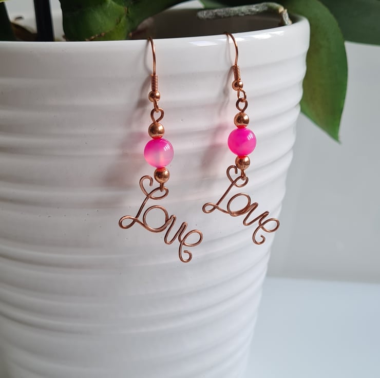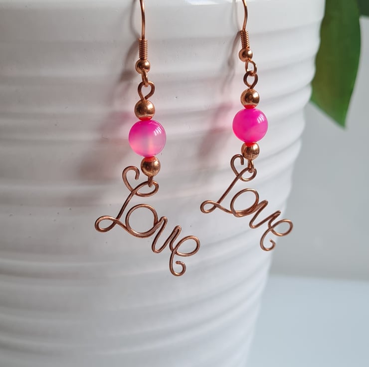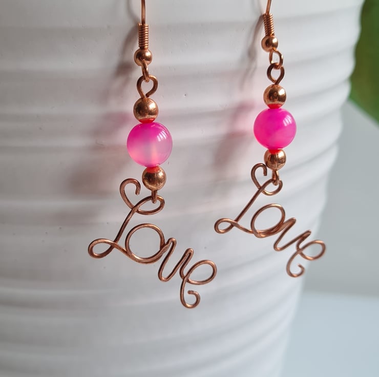 Pink Agate & Copper Dangle LOVE Earrings Gift Crystal Jewellery Jewelry