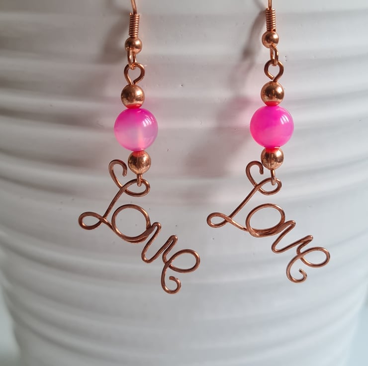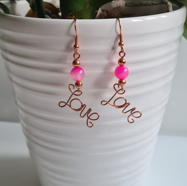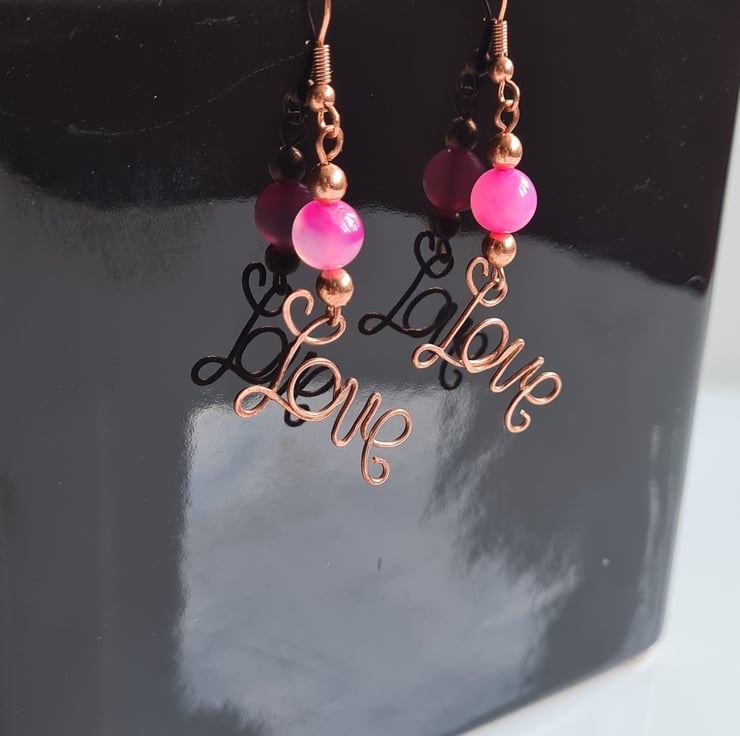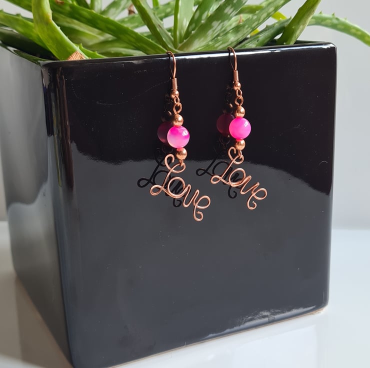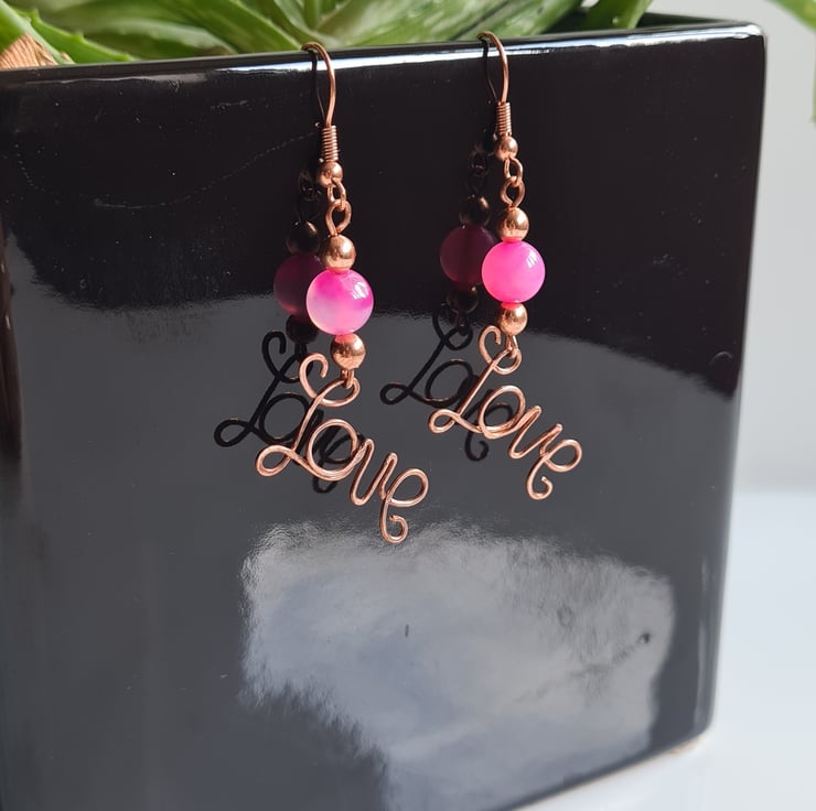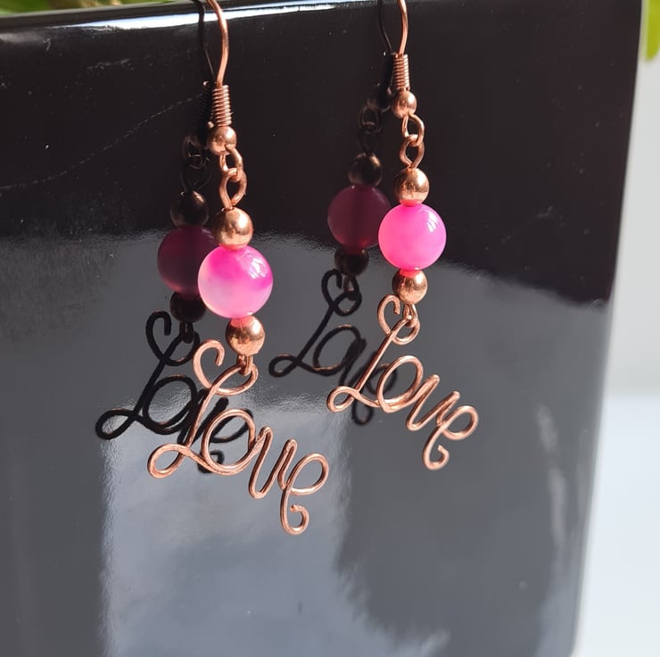 Pink Agate & Copper Dangle LOVE  Earrings Gift Crystal Jewellery Jewelry
