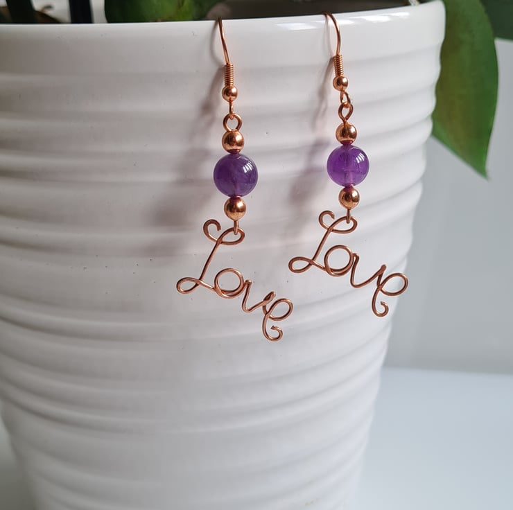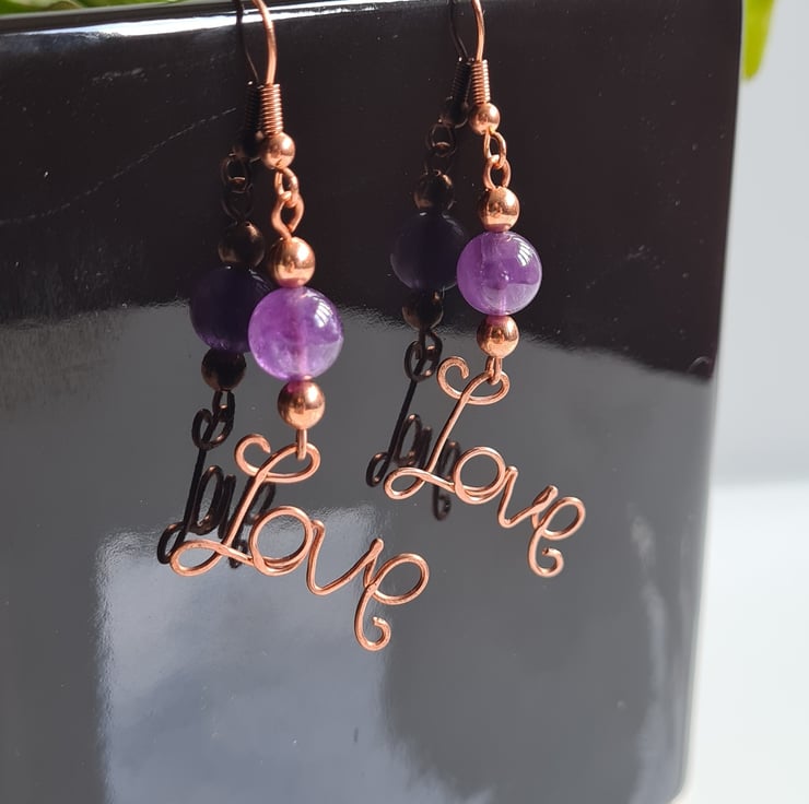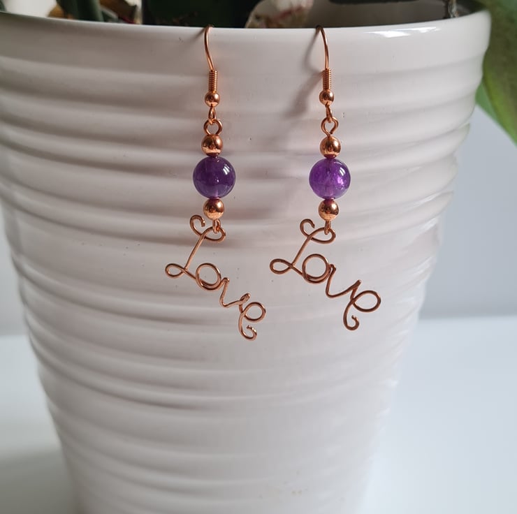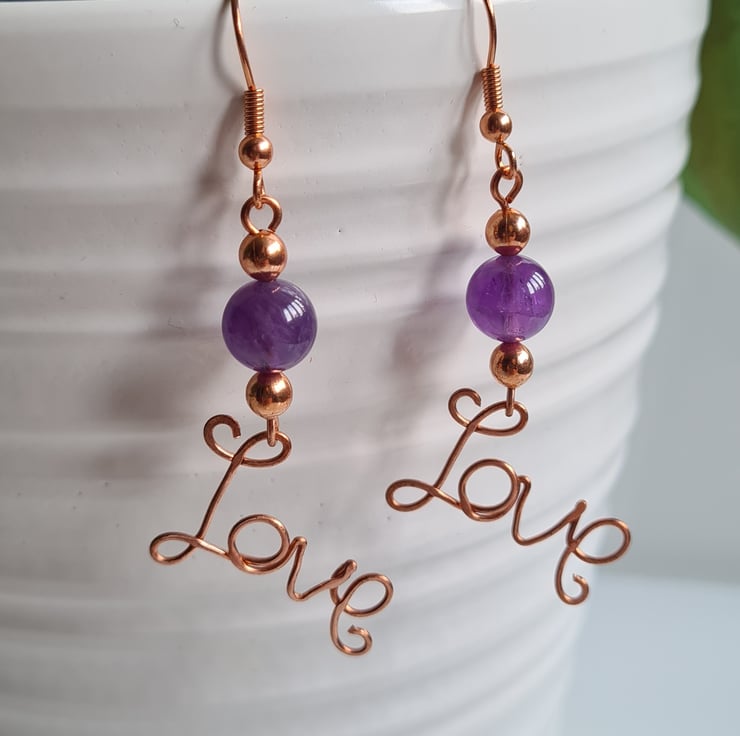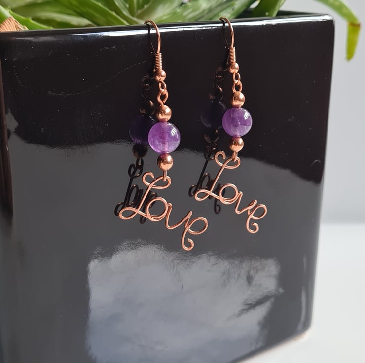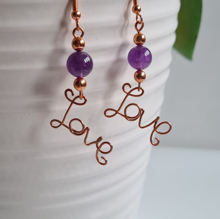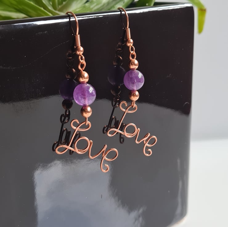Natural Amethyst & Copper Dangle LOVE Earrings Gift Crystal Jewellery Jewelry