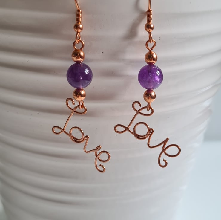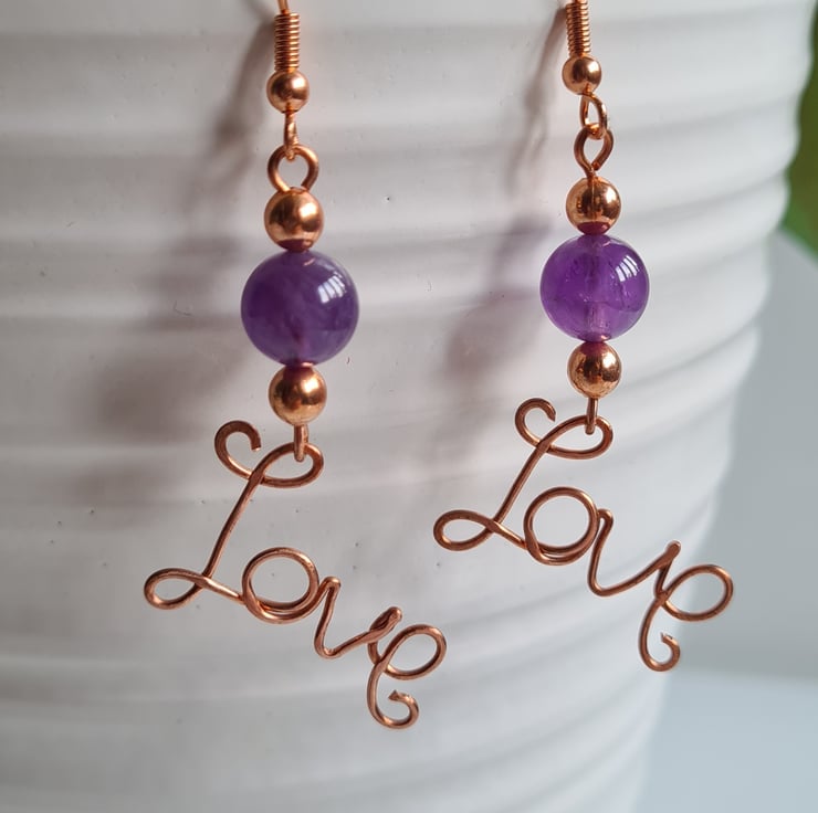 Natural Amethyst & Copper Dangle LOVE  Earrings Gift Crystal Jewellery Jewelry
