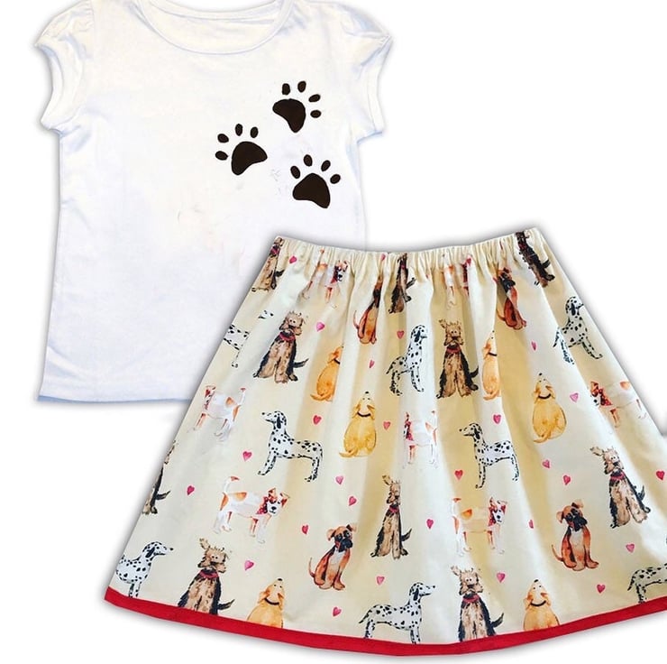 This outfit includes a pretty skirt, made out of cotton dog fabric and a top printed with cute paw prints.